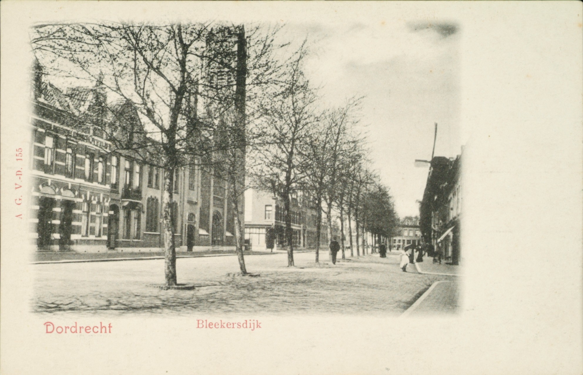 De Wilhelminakerk op de Blekersdijk, hoek Koningin Wilhelminastraat, gezien richting molen De Maagd aan de Cornelis de Wittstraat. Rechtsonder de Waterbeekstraat.