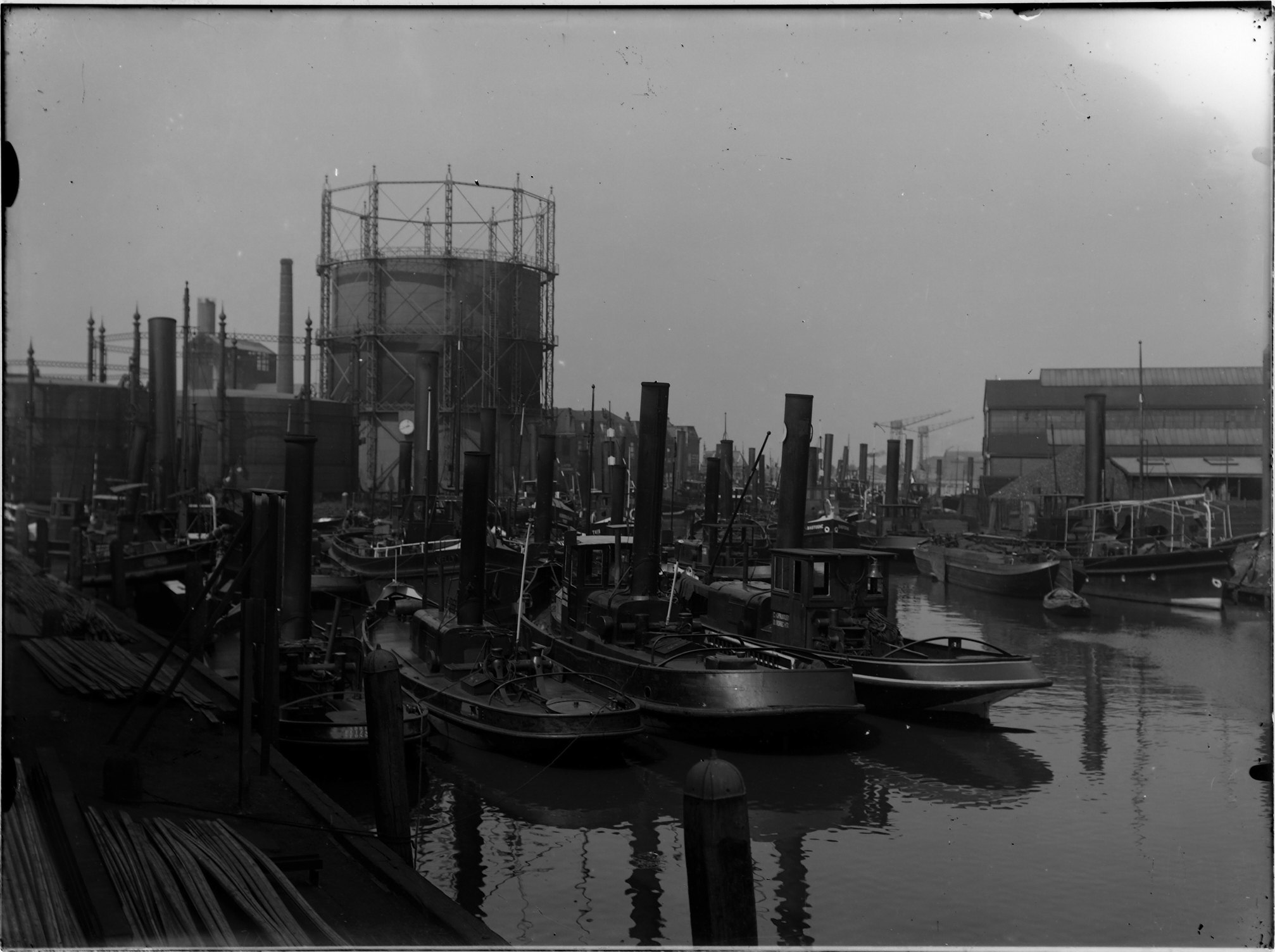 Riedijkshaven met stoomsleepboten en gashouders aan de Bleijenhoek; rechts scheepswerf Koopman
