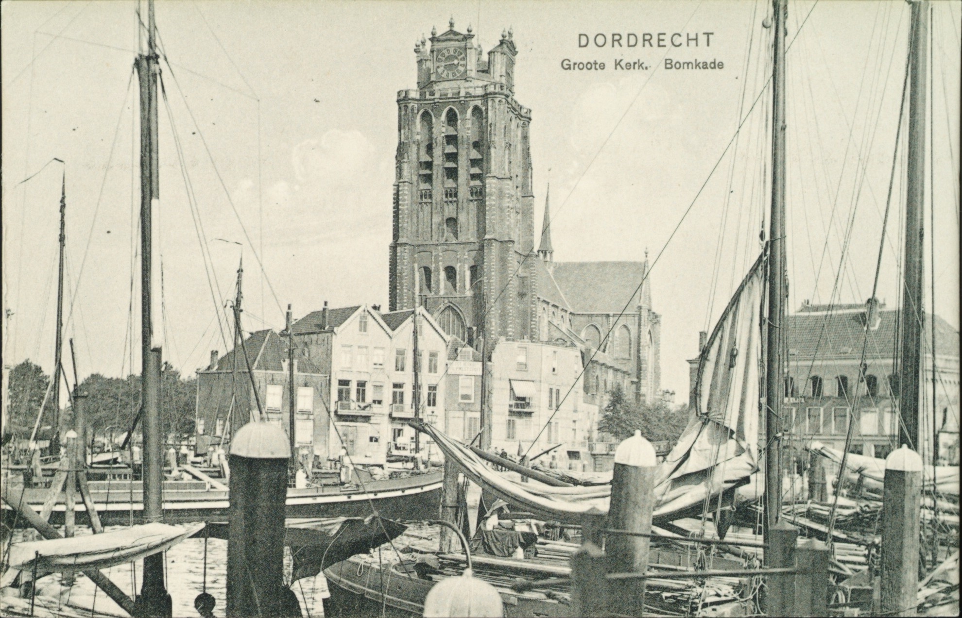 - Bomhaven en Bomkade (rechts), gezien richting Korte Geldersekade en Grote Kerk.
