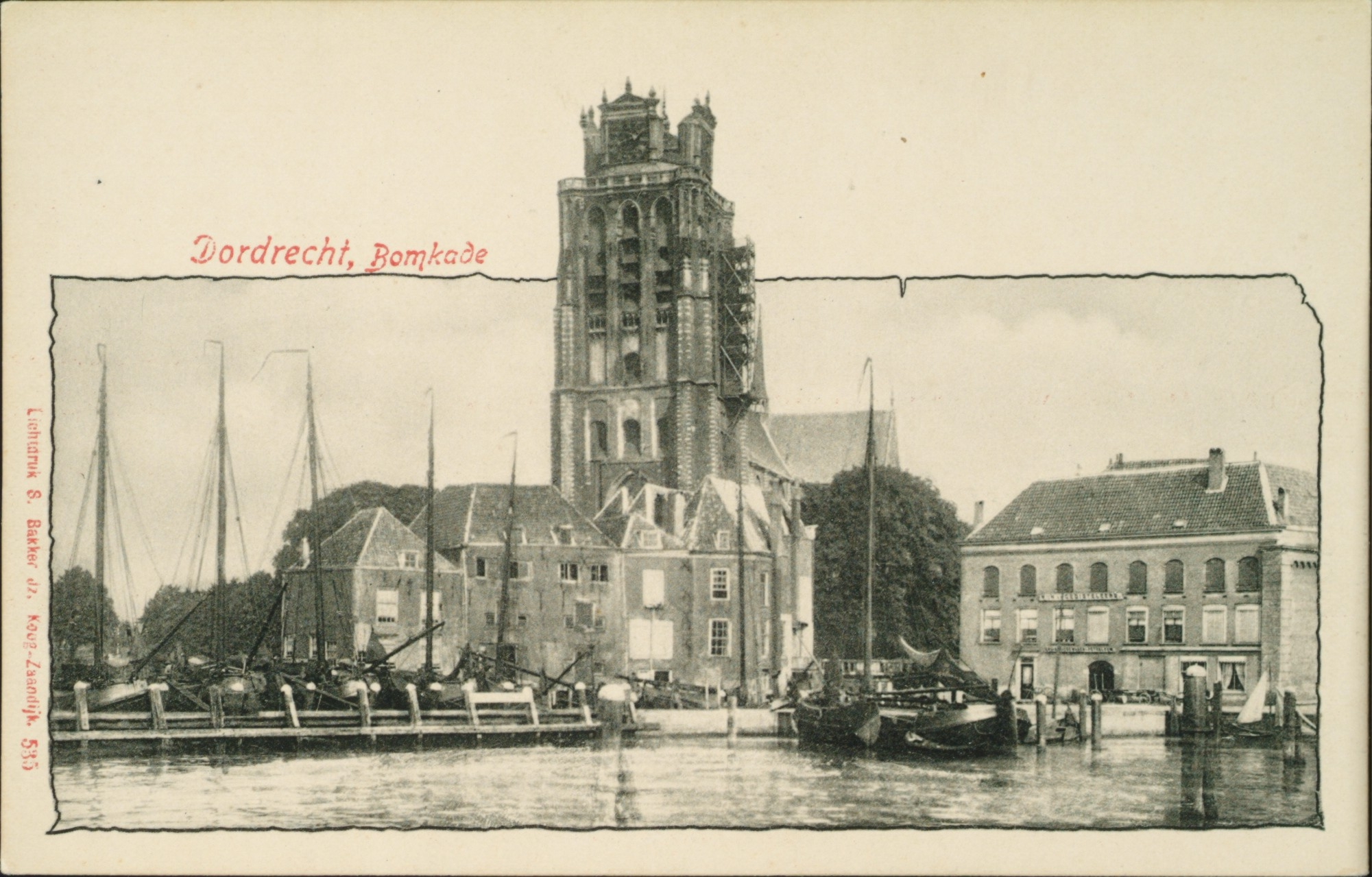 - Bomhaven en Bomkade (rechts), gezien richting Korte Geldersekade en Grote Kerk.