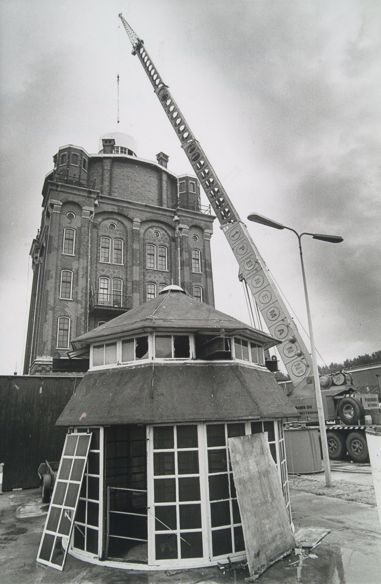 Een telescoopkraan heeft juist de top van het torentje op de watertoren aan de Oranjelaan getild.