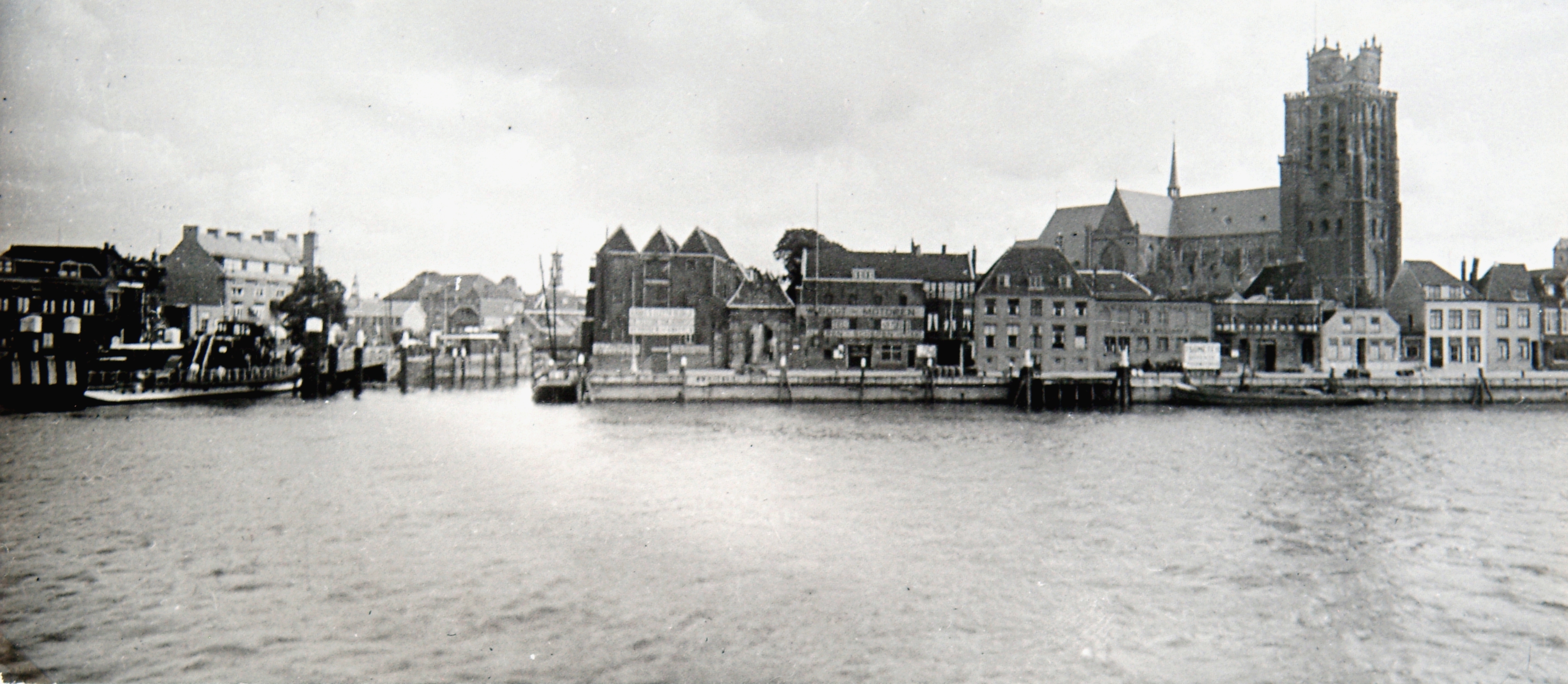 Gezicht op Dordrecht vanaf een veerpont op de Oude Maas