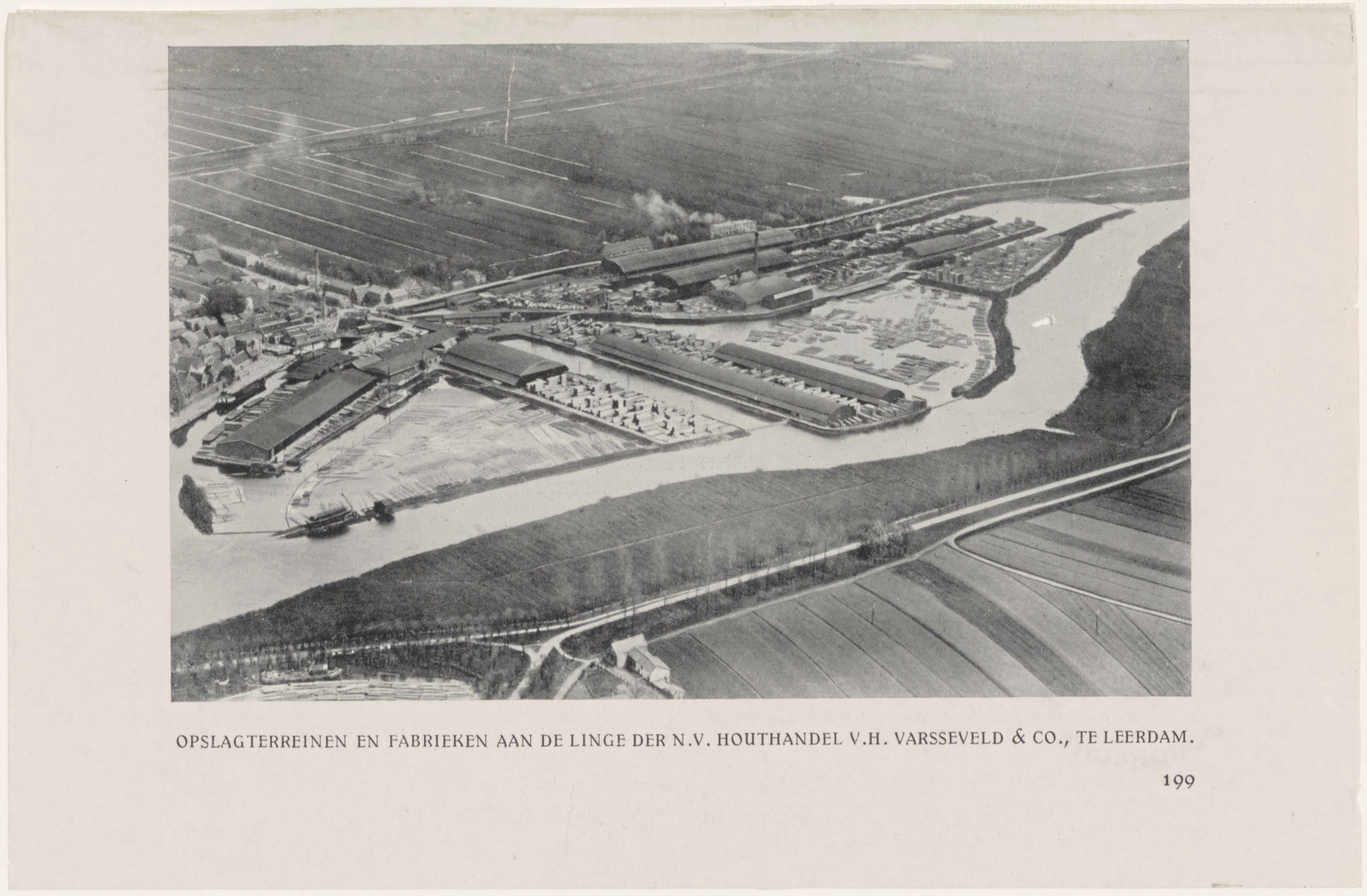 Luchtfoto van houthandel v/h Varsseveld en Co. in Leerdam.