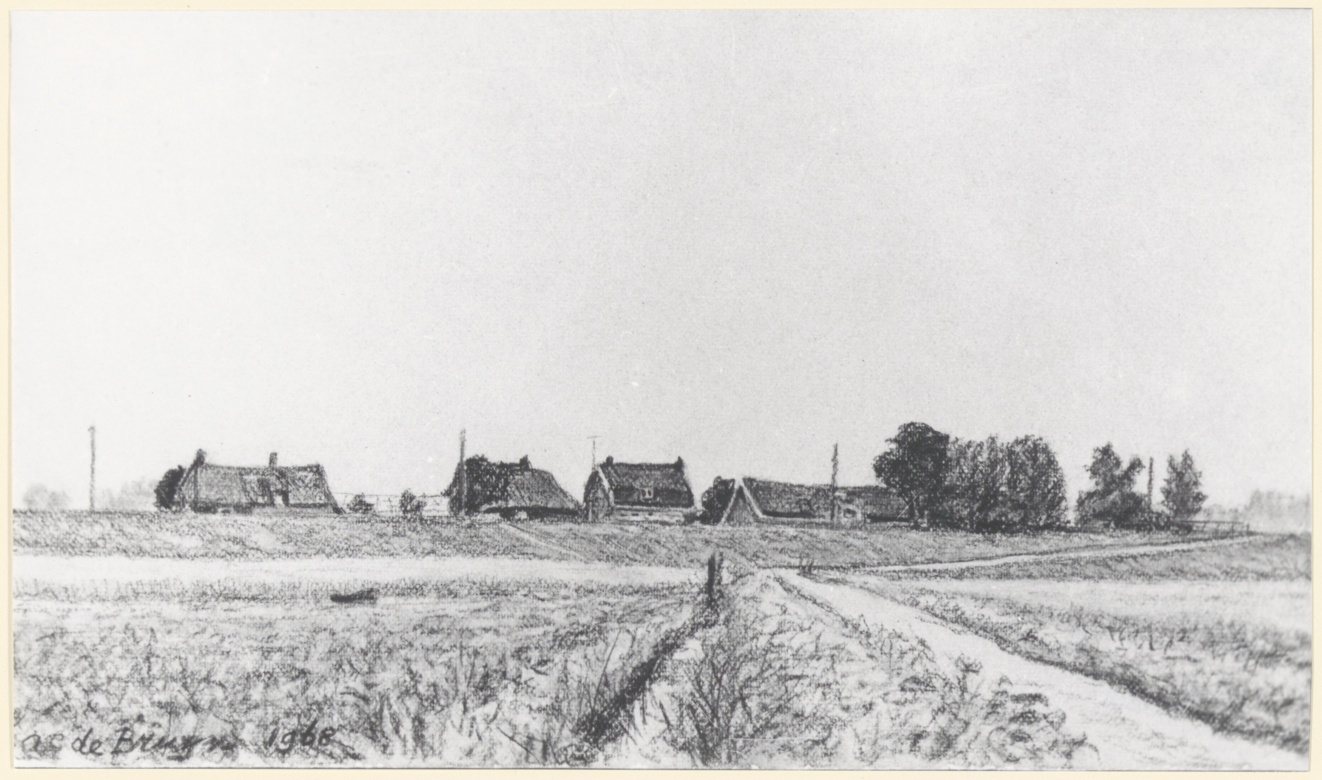Tekening van huizen en een boomgroep aan de Wieldrechtse Zeedijk.