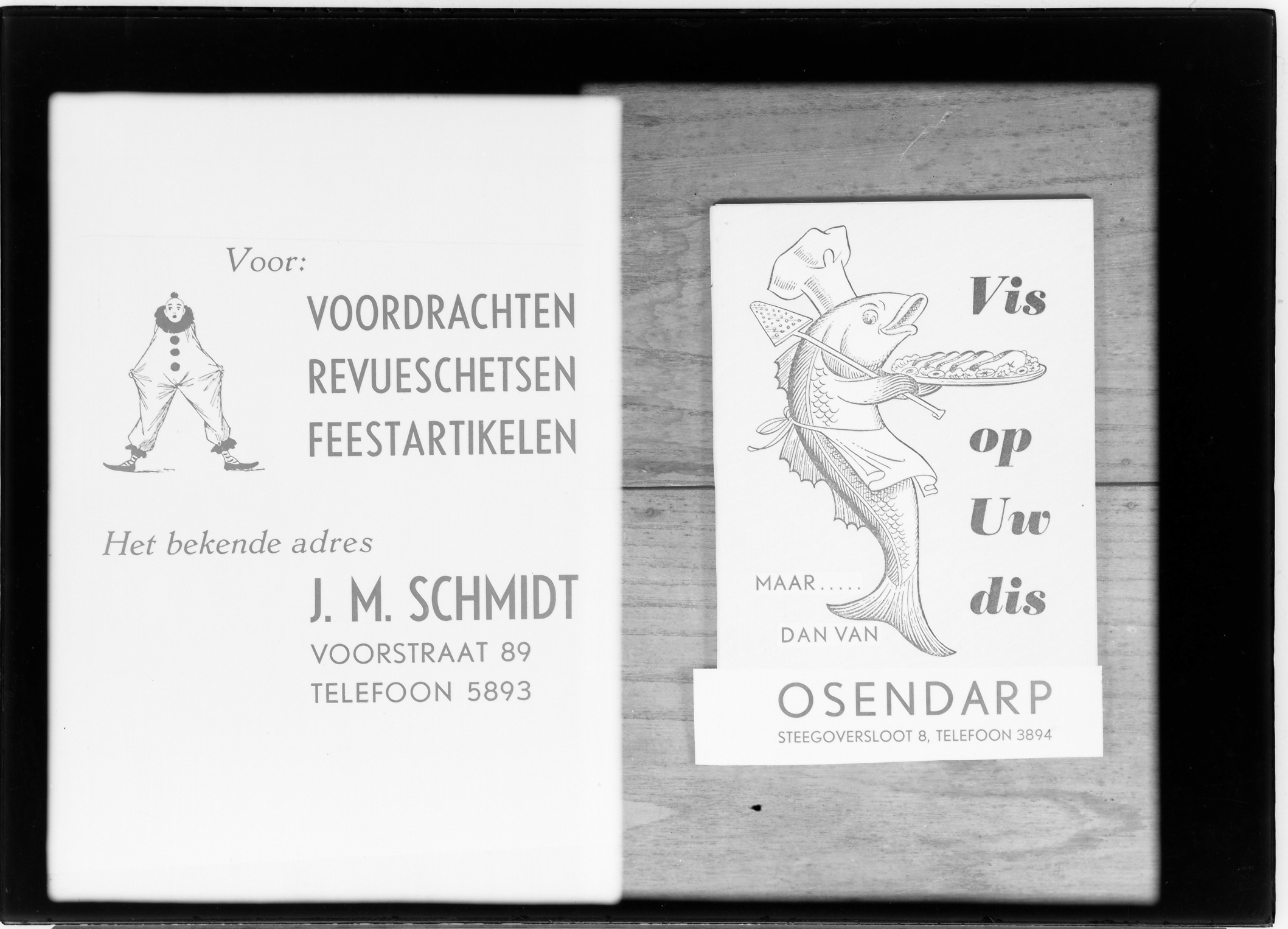 - Twee advertenties één van J.M. Schmidt, Voorstraat 89 en één van Osendarp, Steegoversloot 8