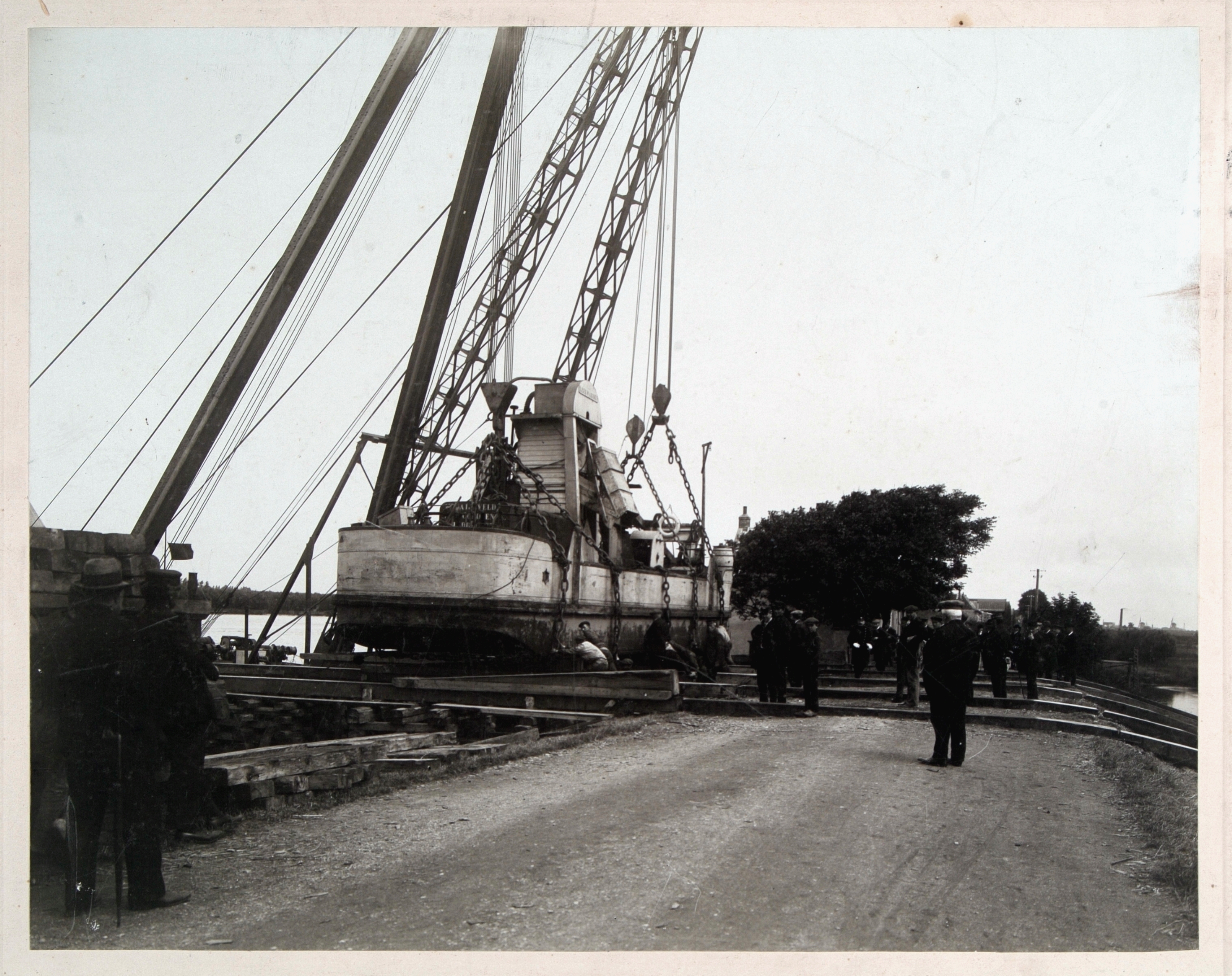 - Een baggerschip wordt over de 's-Gavendeelsedijk getrokken bij de aanleg van de Wilhelminahaven