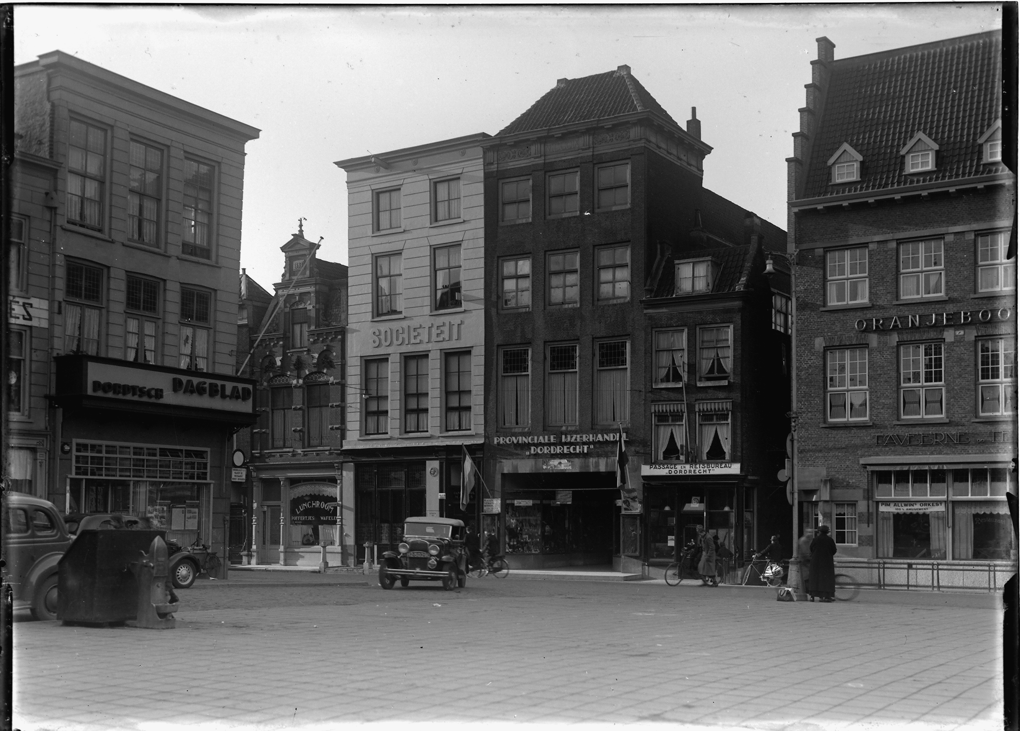 - Noordwest hoek van het Scheffersplein met links de vestiging van het Dordtsch Dagblad. Links vooraan staat een openbare waterpomp, waaruit men kon drinken door op den voetpedaal te drukken. Links naast de sociëteit is poffertjeszaak Visser te zien. De sociëteit met dansschool was van Henk Eyskoot. Rechts daarvan ijzerhandel Mennens en Co., een reisbureau, de Tolbrugstraat Waterzijde en restaurant Ter Merwe.