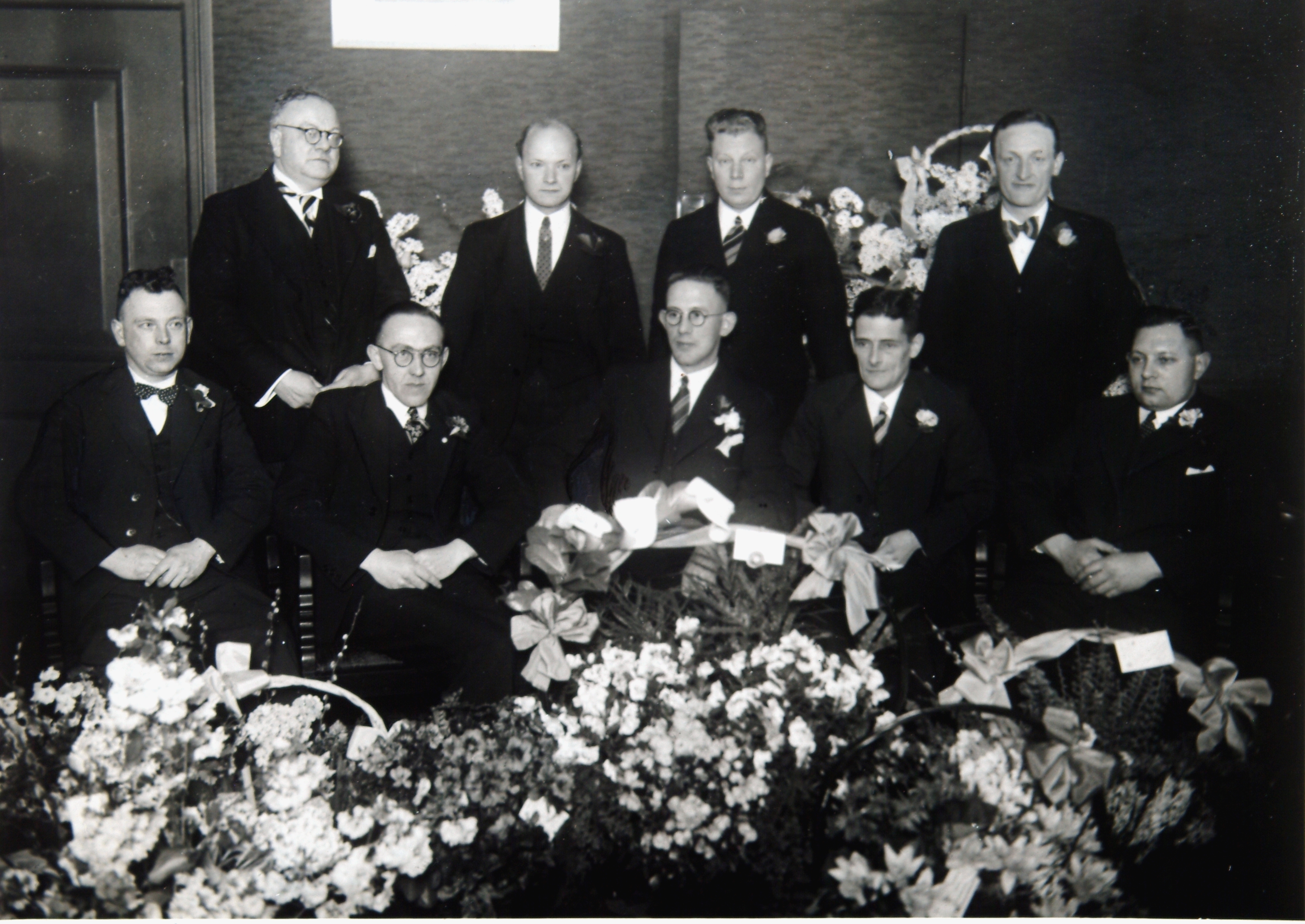 - Het bestuur van de afdeling Dordrecht van de Vereniging van Christelijke Handels- en Kantoorbedienden "Mercurius" tijdens het 40-jarig jubileum van de vereniging.