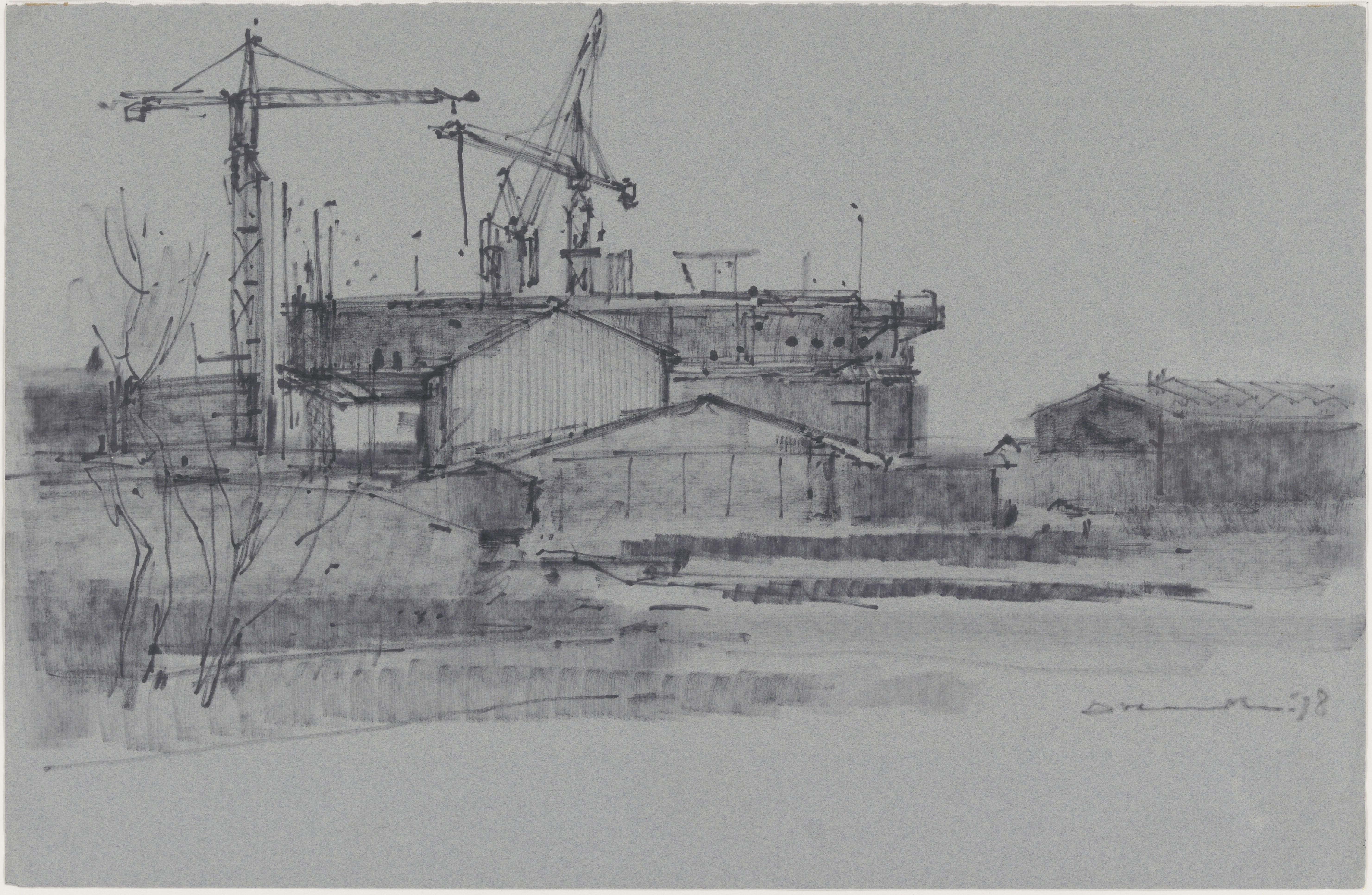 - Werf van metaalindustrie Penn & Bauduin aan de 's-Gravendeelsedijk met een boorplatform in aanbouw.