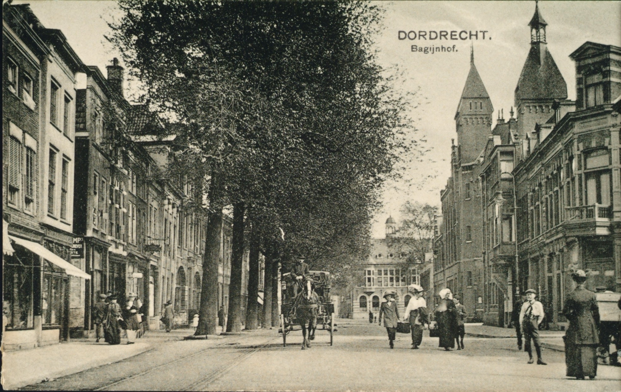 Met een koets en de rails van de paardentram. Rechts de hoek van het Achterom en de hoek van de Raamstraat