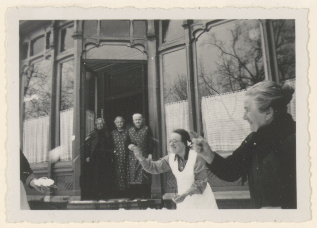 Bejaarden en een verzorgster gewikkeld in een sneeuwballengevecht achter Huize Avondzon …