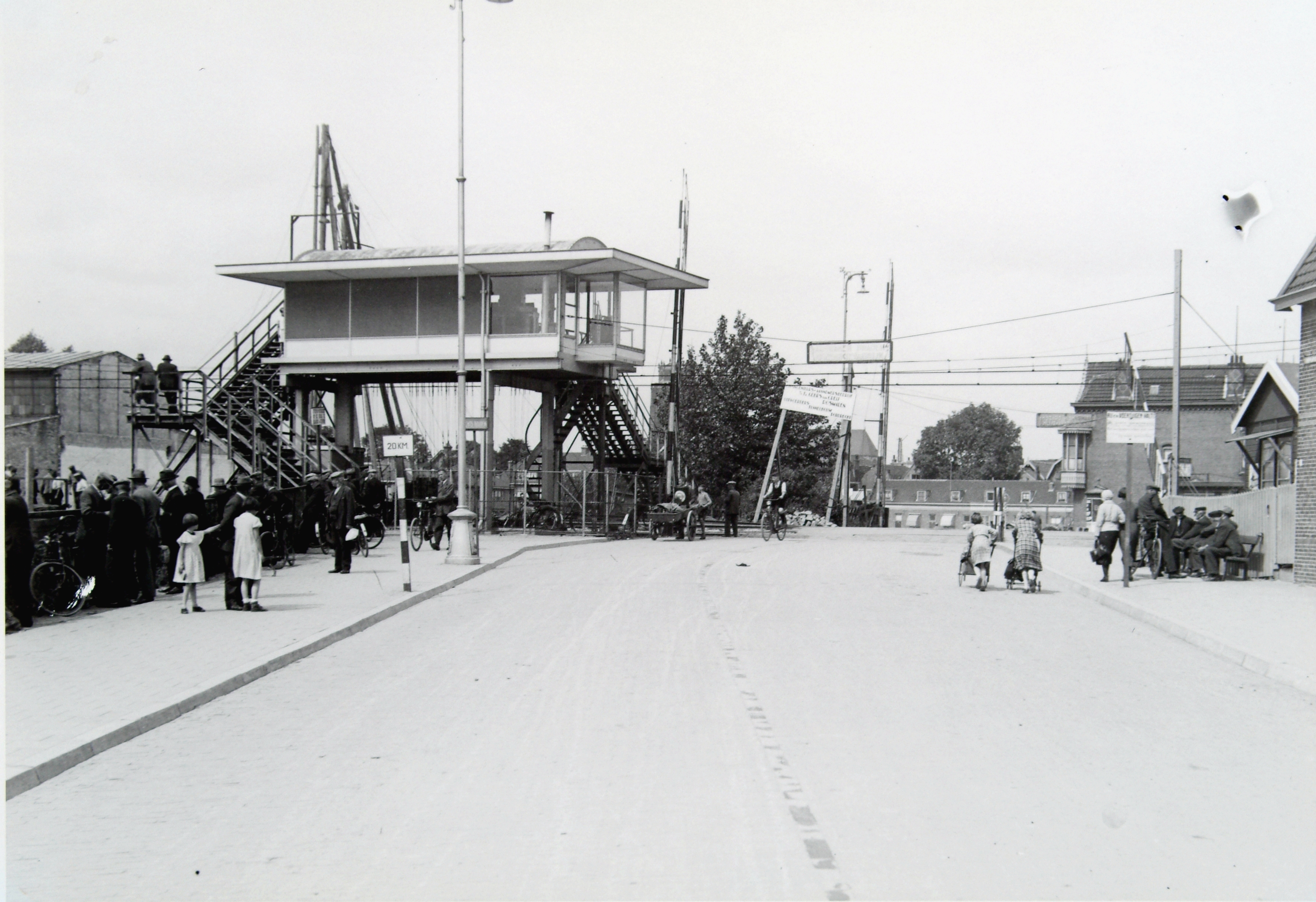 Overweg en voetgangersbrug over het spoor aan de Krispijnseweg, naar het noorden gezien.