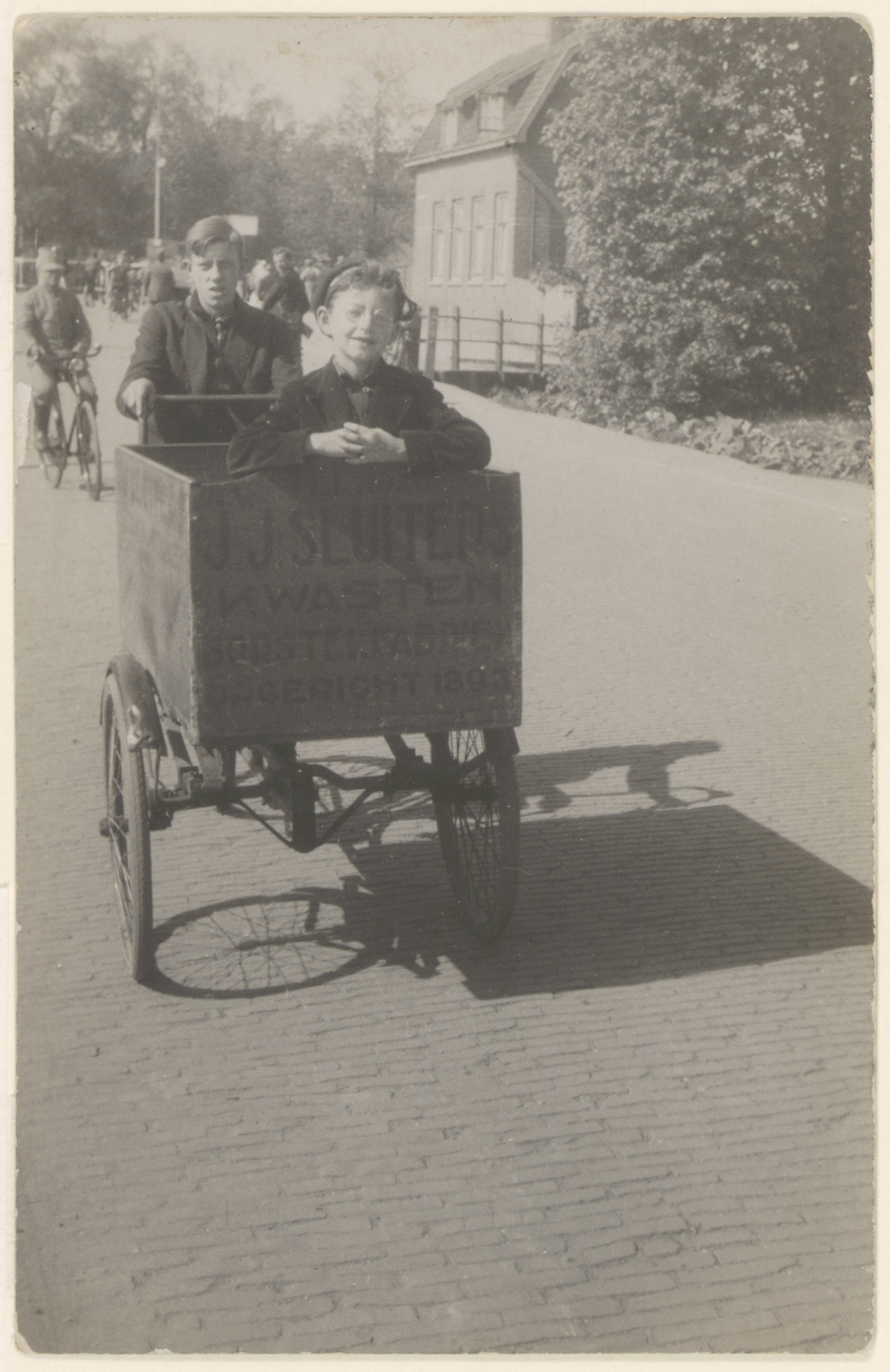 - Bakfiets van J.J. Sluiters Kwast- en Borstelfabriek (opgericht in 1893) op de Krispijnseweg ter hoogte van villa Weizigt. Het jongetje in de bak is de zoon van de borstelmaker.
