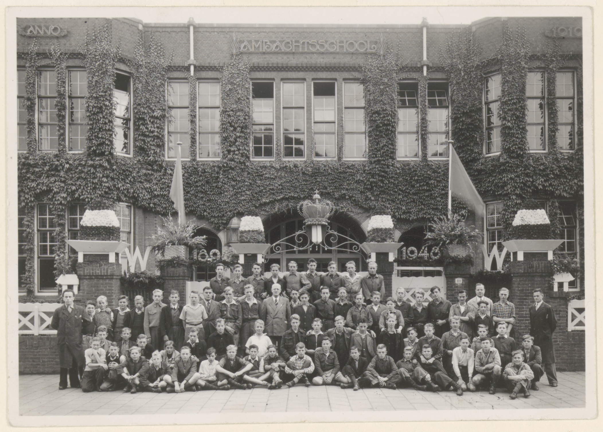 Groepsportret van scholieren en enkele leerkrachten voor de Ambchtsschool aan Reeweg Oost, die versierd is ter gelegenheid van het regeringsjubileum van Wilhelmina in 1948.