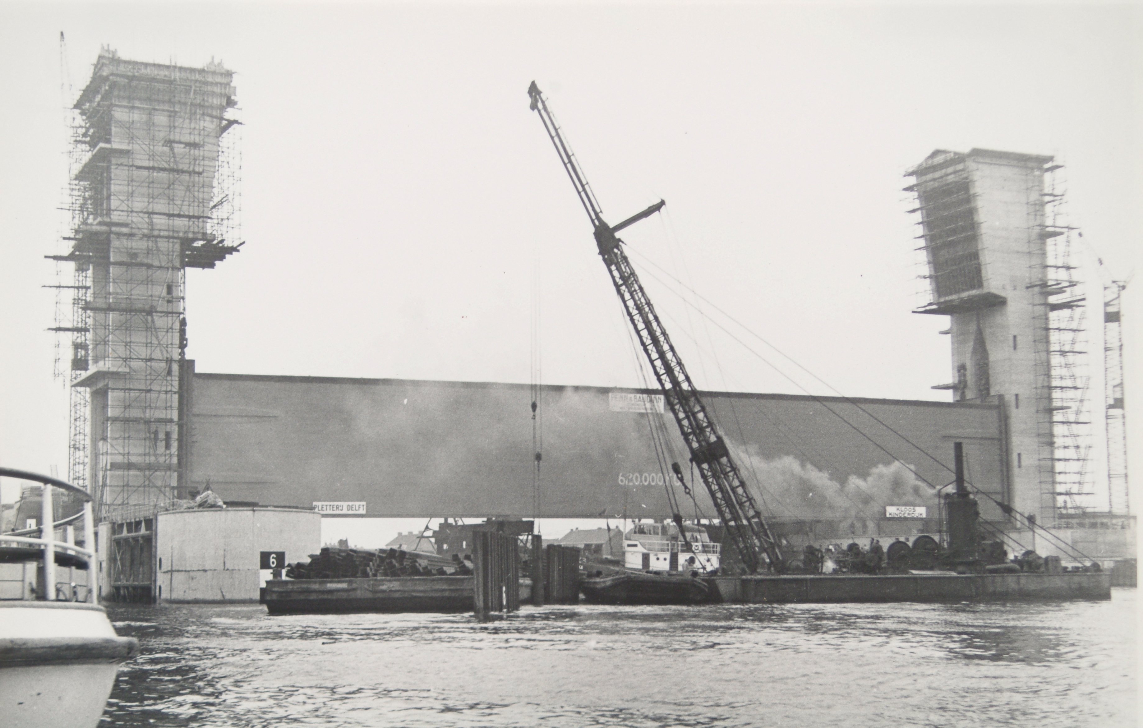 Plaatsing van de stuw in de Hollandse IJssel bij Capelle aan den IJssel. Stuw gebouwd door Penn & Bauduin