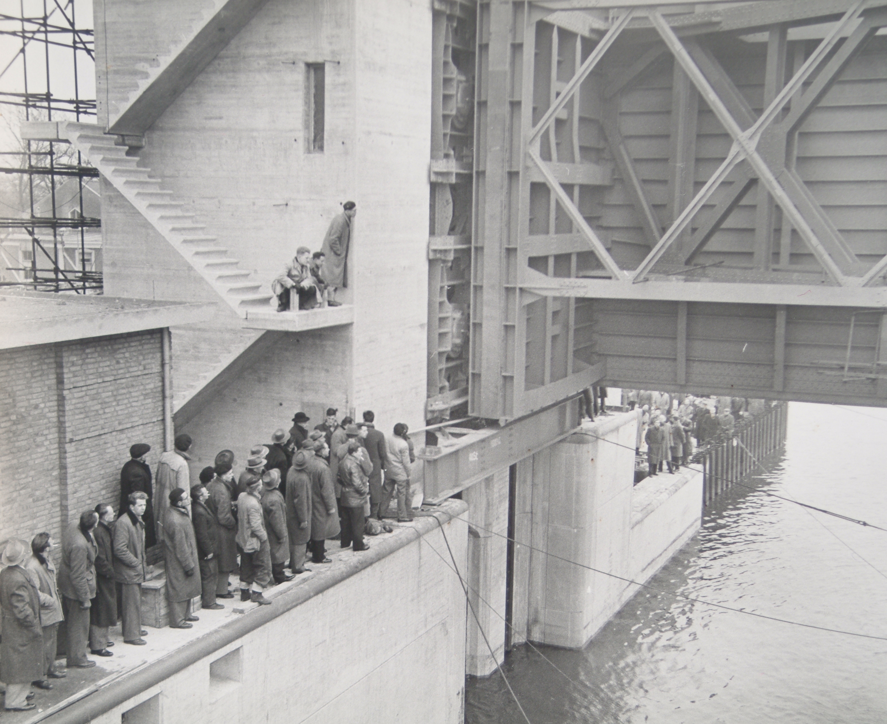 - Plaatsing van de stuw in de Hollandse IJssel bij Capelle aan den IJssel. Stuw gebouwd door Penn & Bauduin