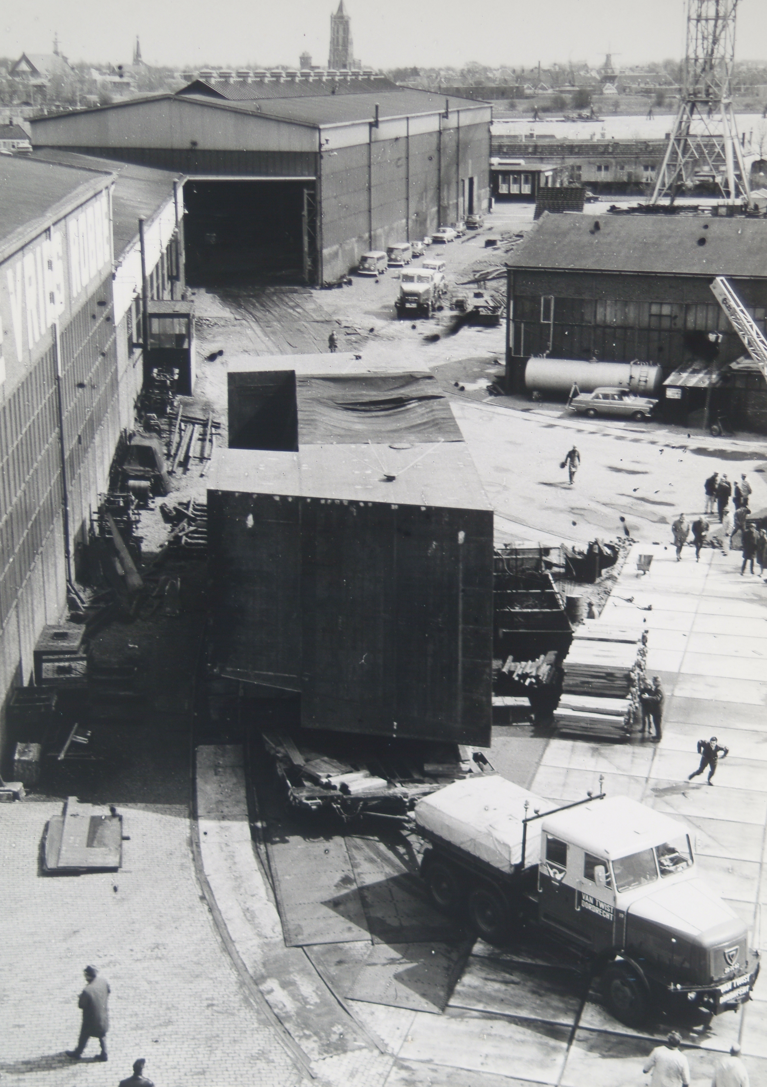 Een vrachtauto van de firma Van Twist voor een wagen met een metalen constructie op de werf van De Vries & Robbé te Woudrichem