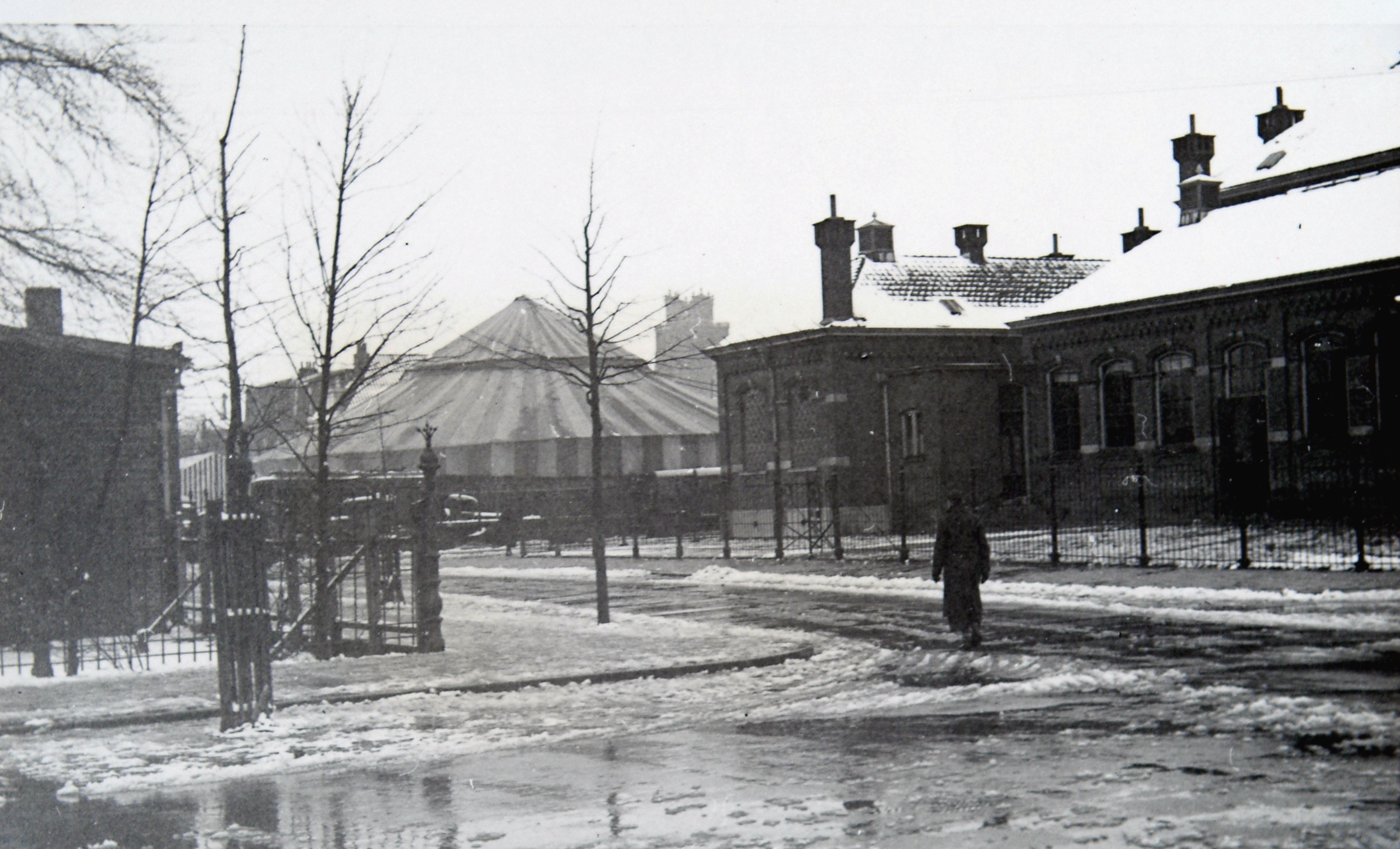 - Gezicht op de achterzijde van het gymnasium vanuit het Beverwijcksplein. Links is nog een gedeelte van het vroegere arbeidsbureau zichtbaar.