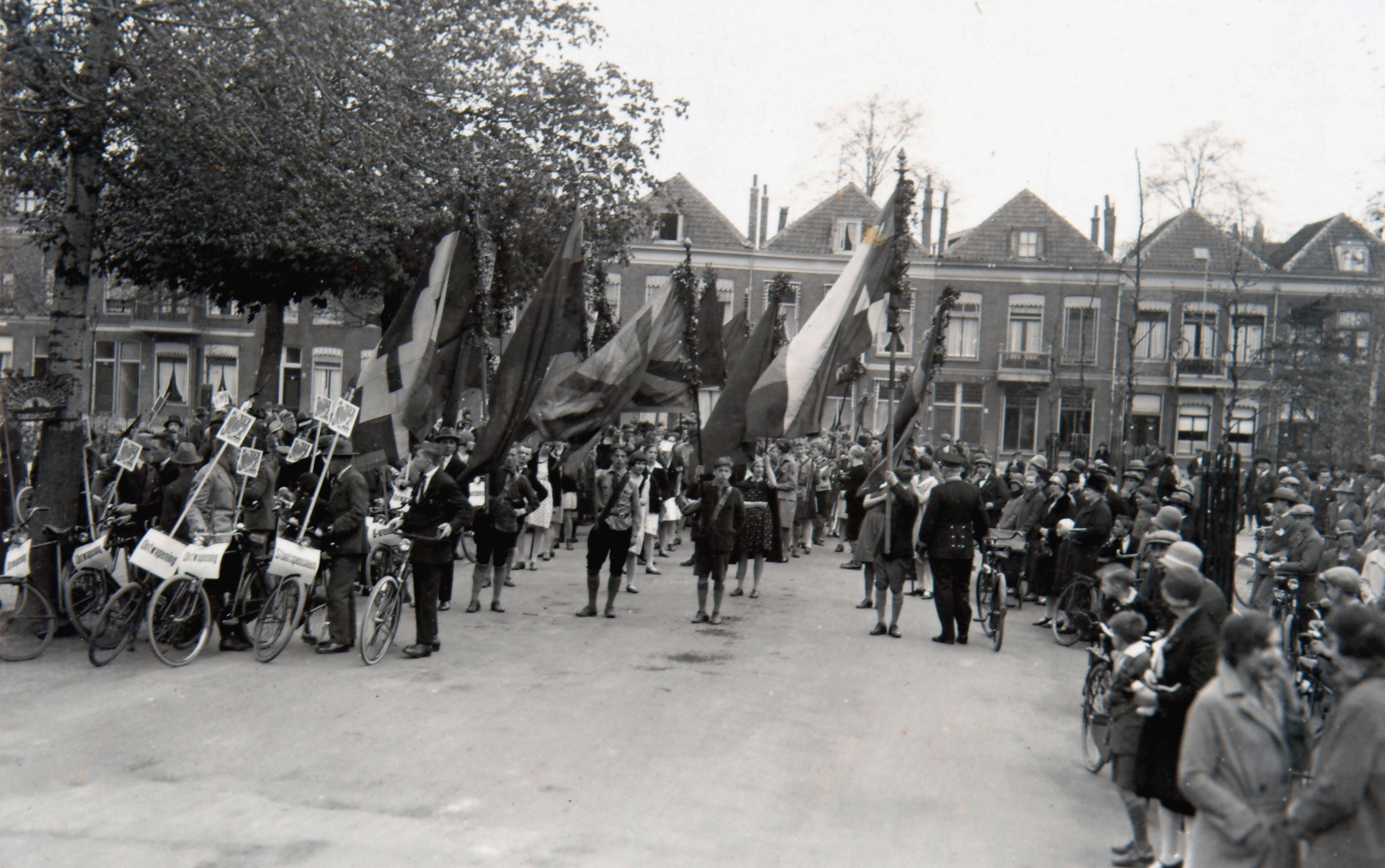 - De 1 mei optocht van de S.D.A.P. wordt onder veel belangstelling opgesteld op het Beverwijcksplein. Erachter zijn de gevels van huizen aan de Matthijs Balenstraat te zien.