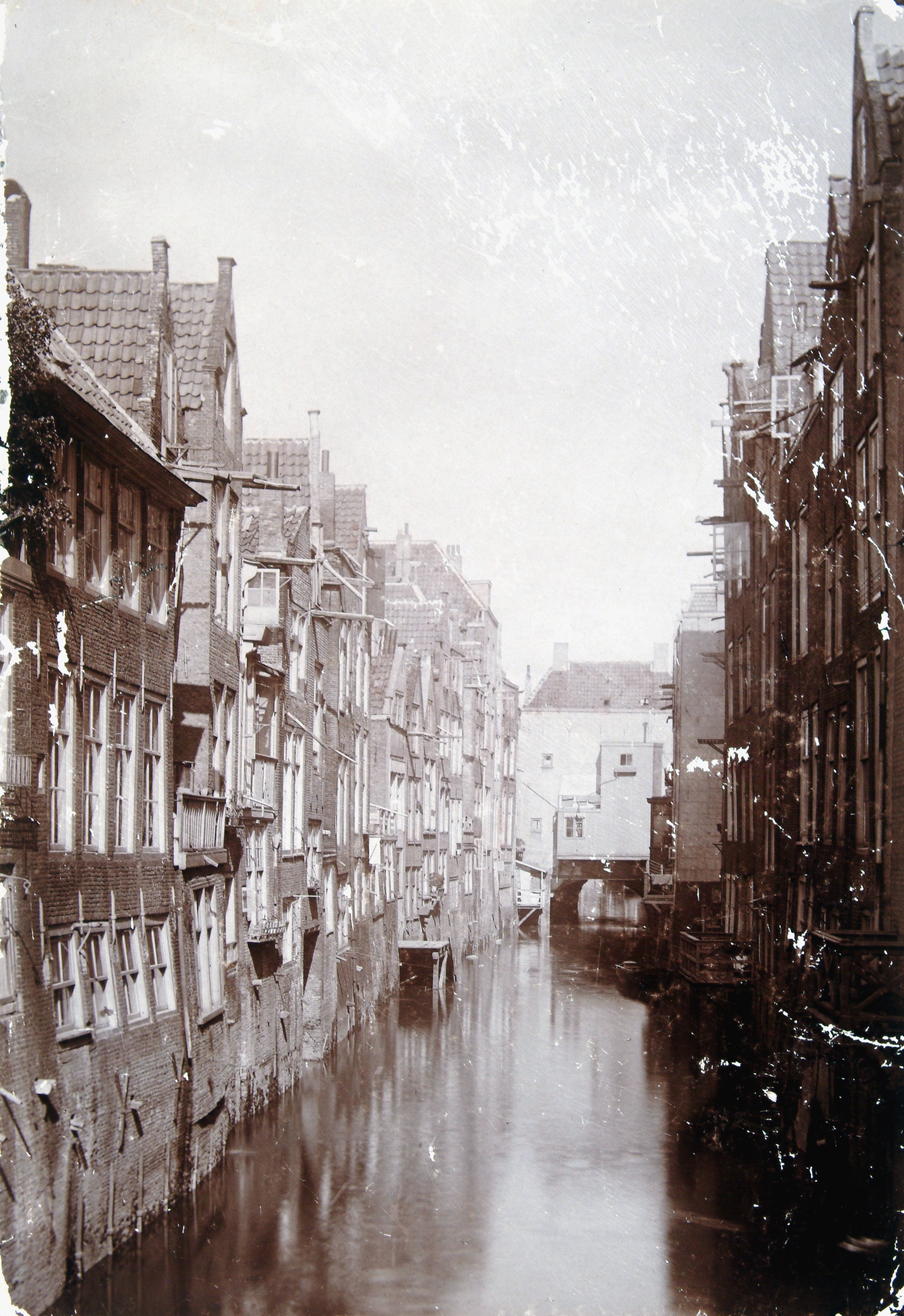 - Voorstraatshaven vanaf de Visbrug naar het Scheffersplein gezien. Links de Groenmarkt, recht de Voorstraat.