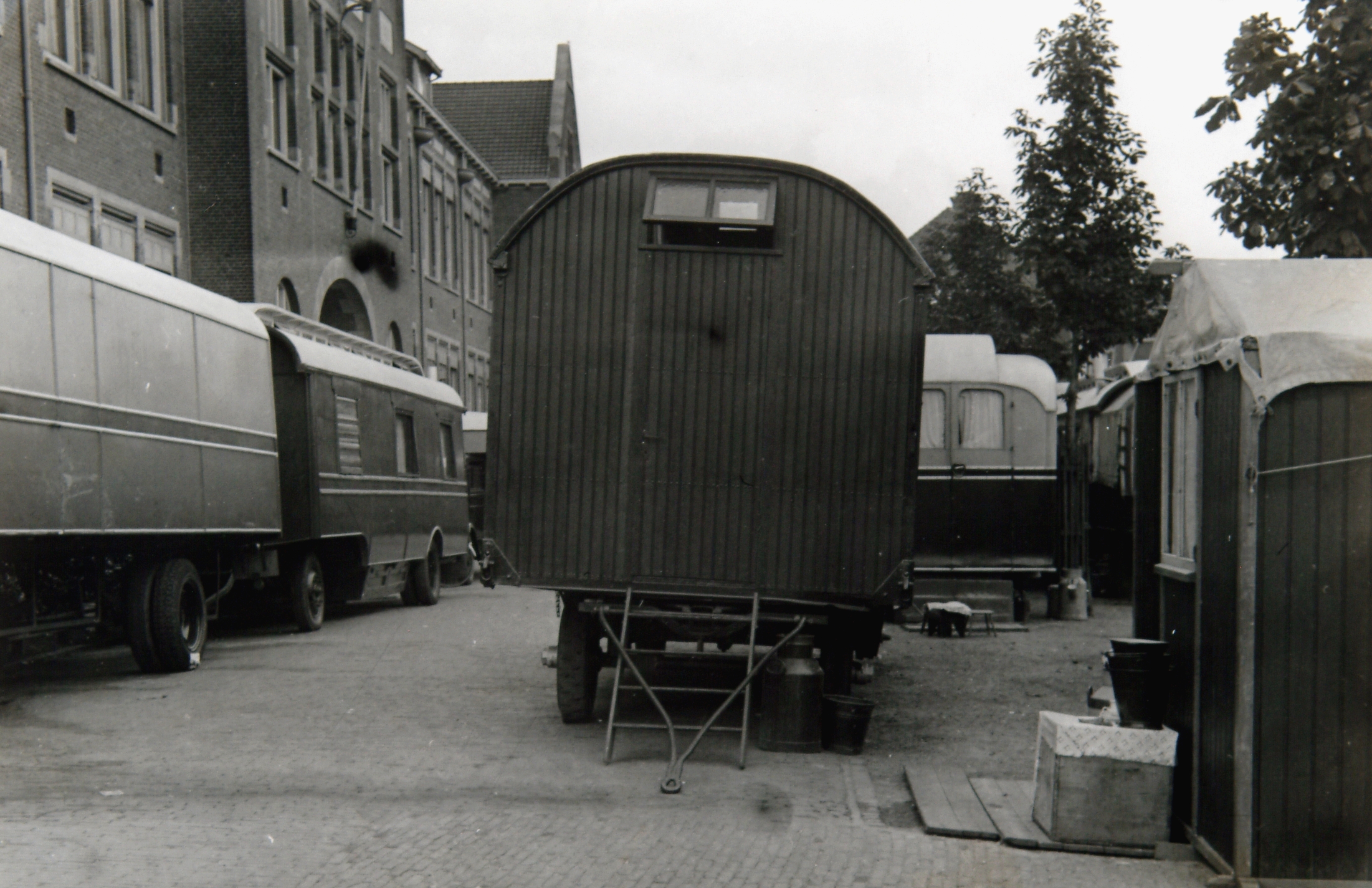 - Kermiswagens voor de H.B.S. in het Oranjepark tijdens de feestweek bij de opening van de verkeersbrug over de Oude Maas.