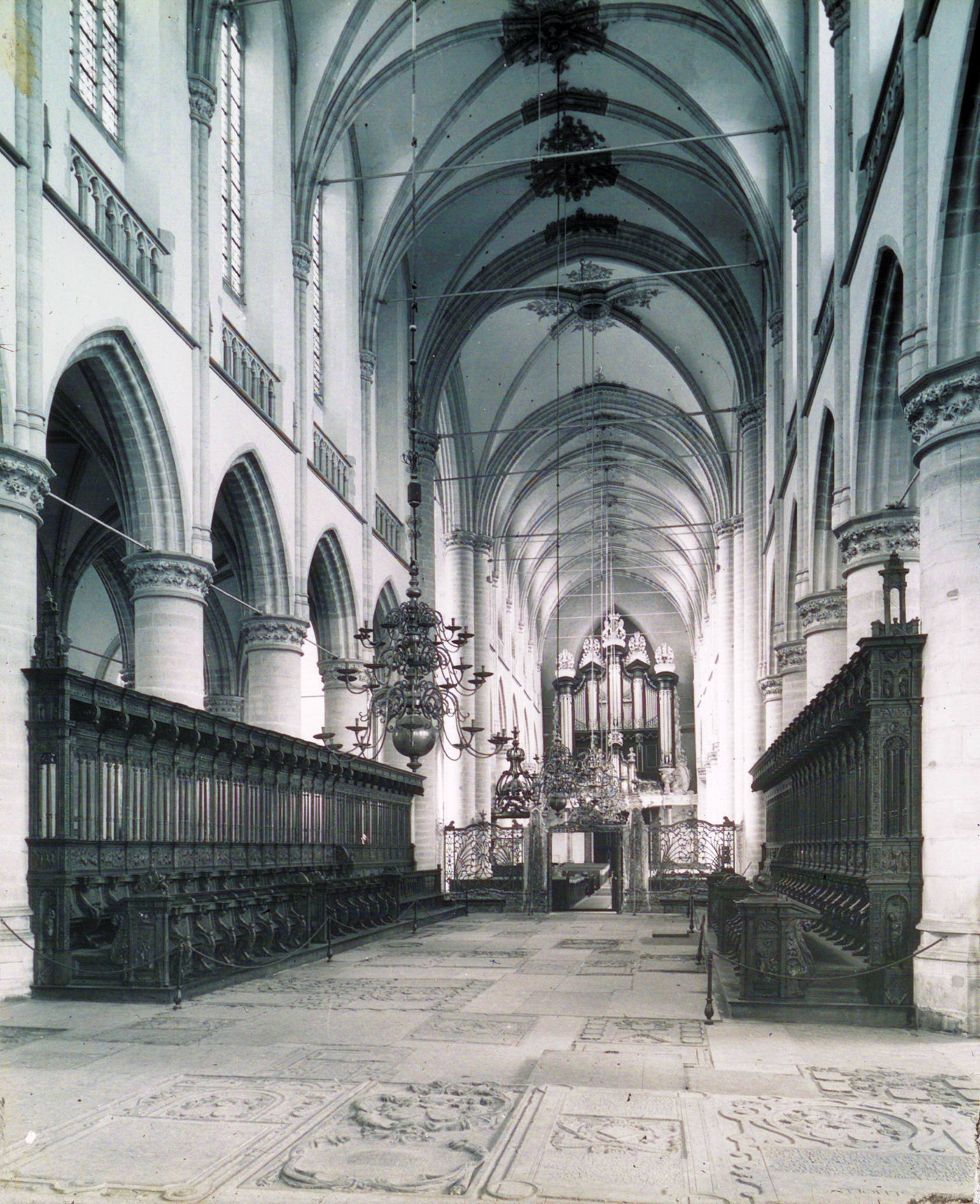 - Het interieur, middenschip van de Grote Kerk met nadruk op de bogen en de vloer.