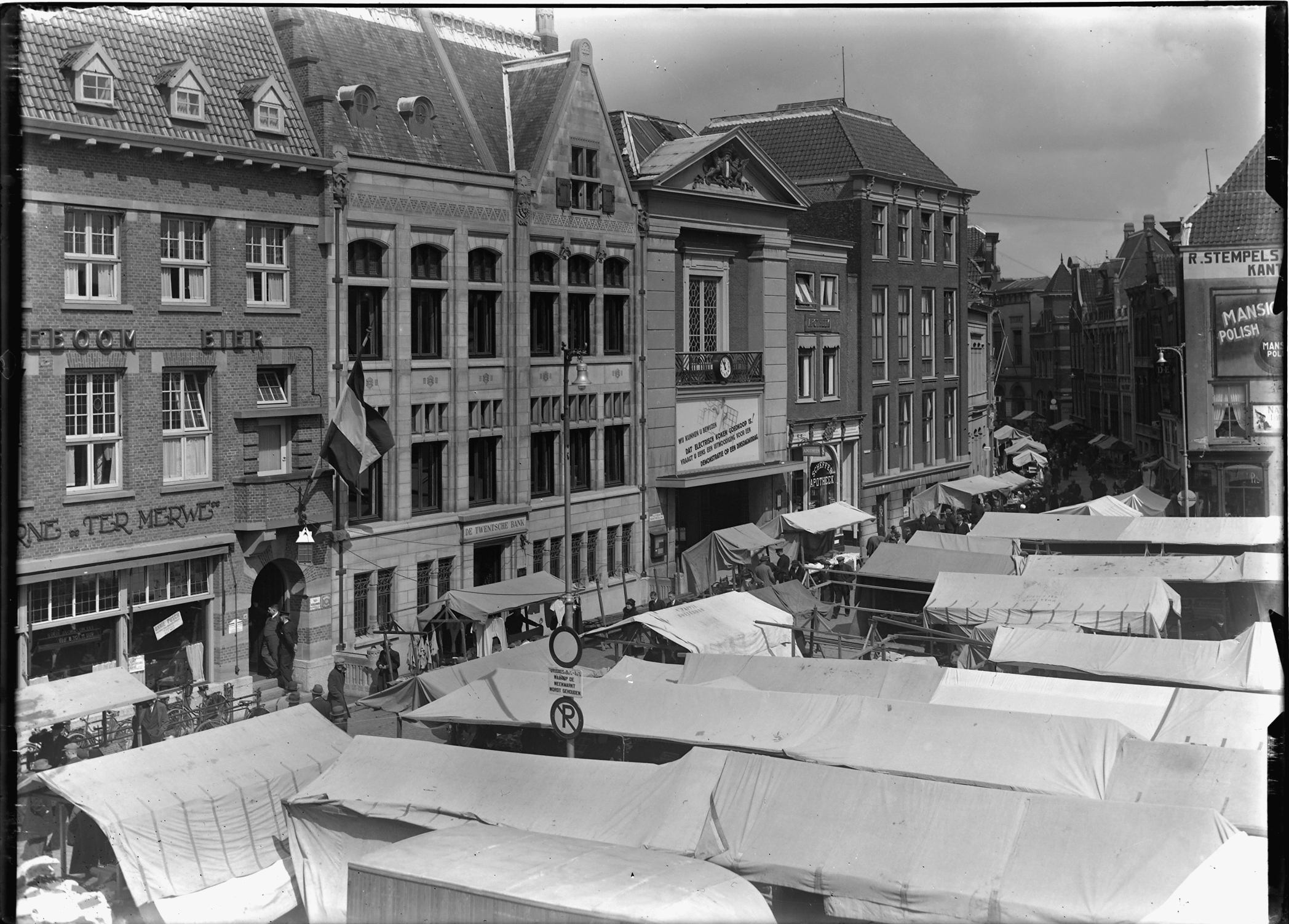 - Marktkramen op het Scheffersplein, de Groenmarkt en in de Wijnstraat. Rechts naast restaurant Ter Merwe is de Twentsche Bank, dan het Waaggebouw dat door het G.E.B. werd gebruikt, dan apotheek Kluit en v.d. Ven en tot slot de christelijke H.B.S.