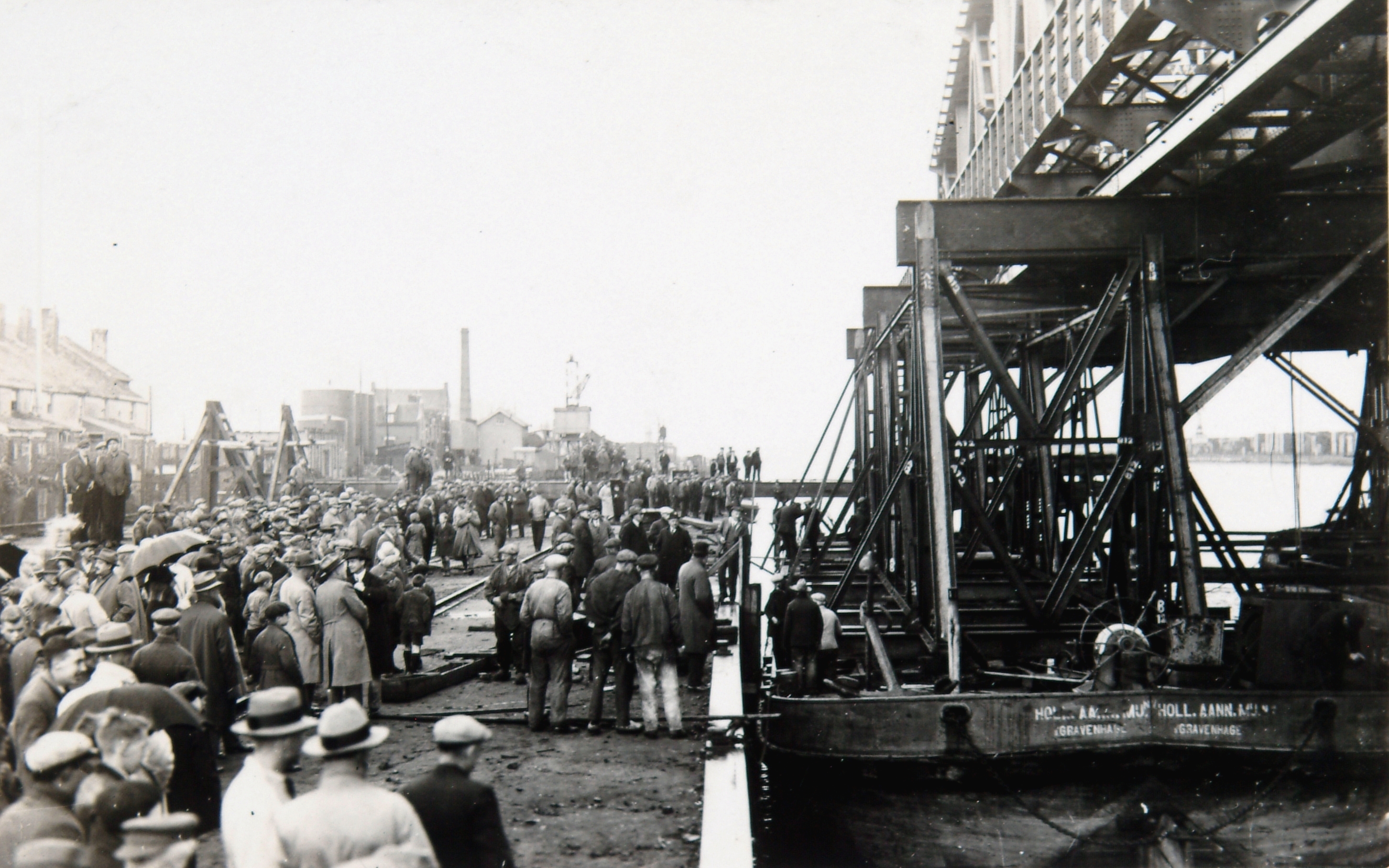 Verslepen van een brugdeel van de brug bij Keizersveer.