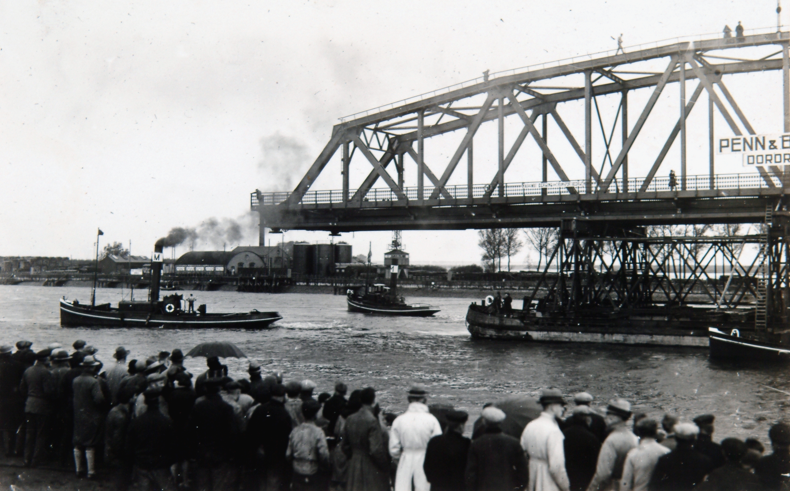 - bruggenbouw pontons publiek / toeschouwers stoomsleepboten verkeersbruggen