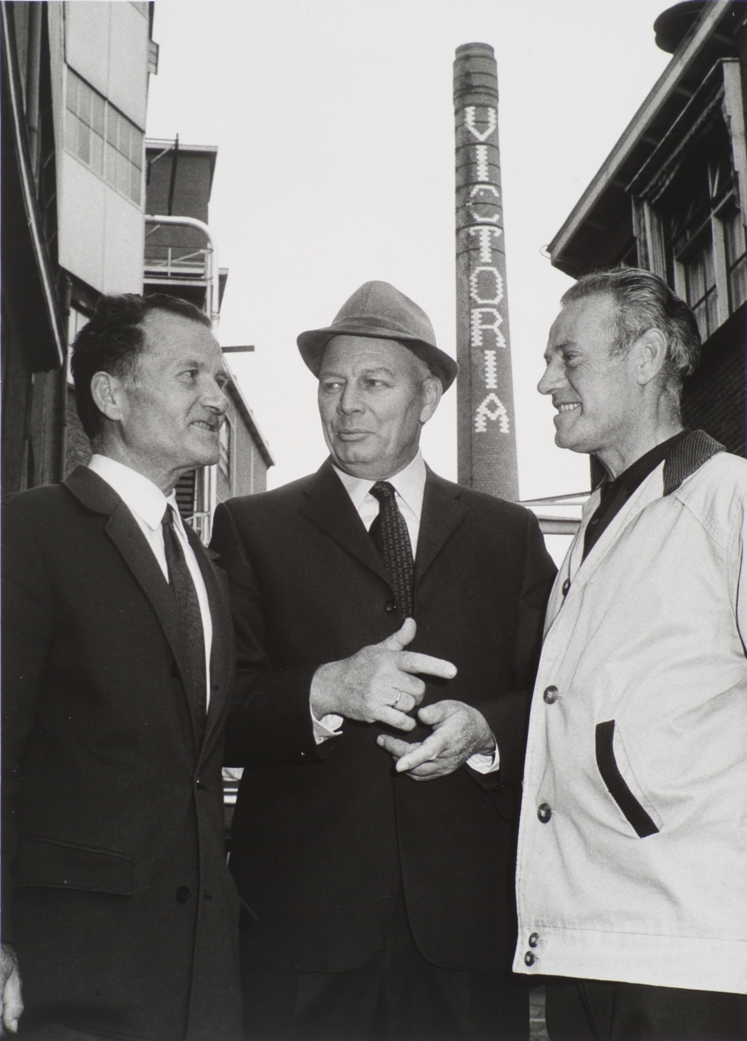 Drie heren op het fabrieksterrein van de chocolade- en biscuitfabriek Victoria aan de Korte Parallelweg