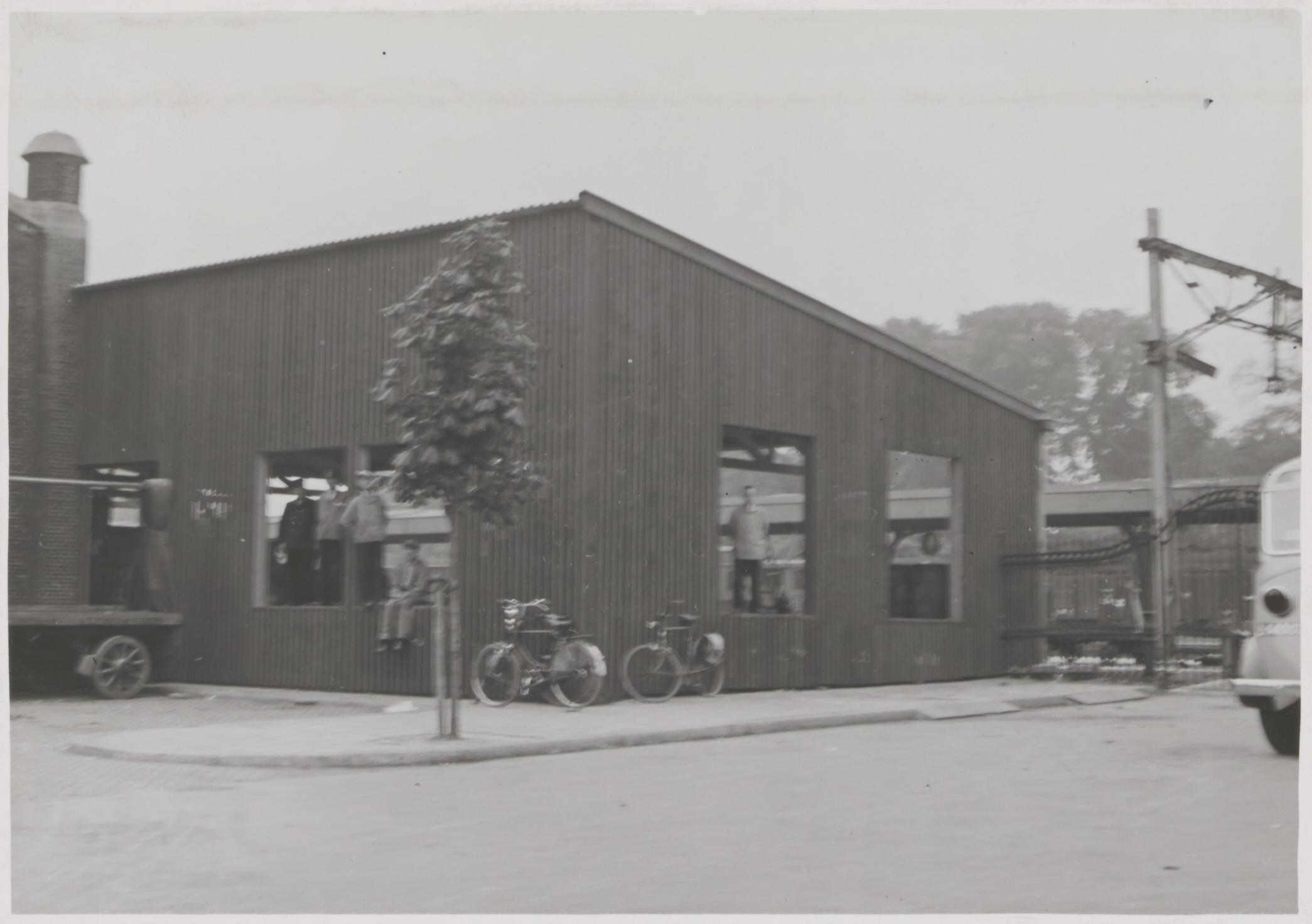 Houten aanbouw aan de goederenloods van de Nederlandse Spoorwegen aan de Burgemeester …
