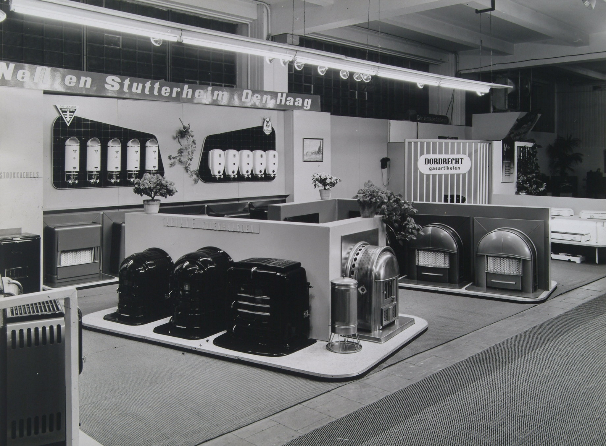 - Stand van de Meterfabriek in Den Haag met fornuizen, ovens, haarden, geisers en tweepitters