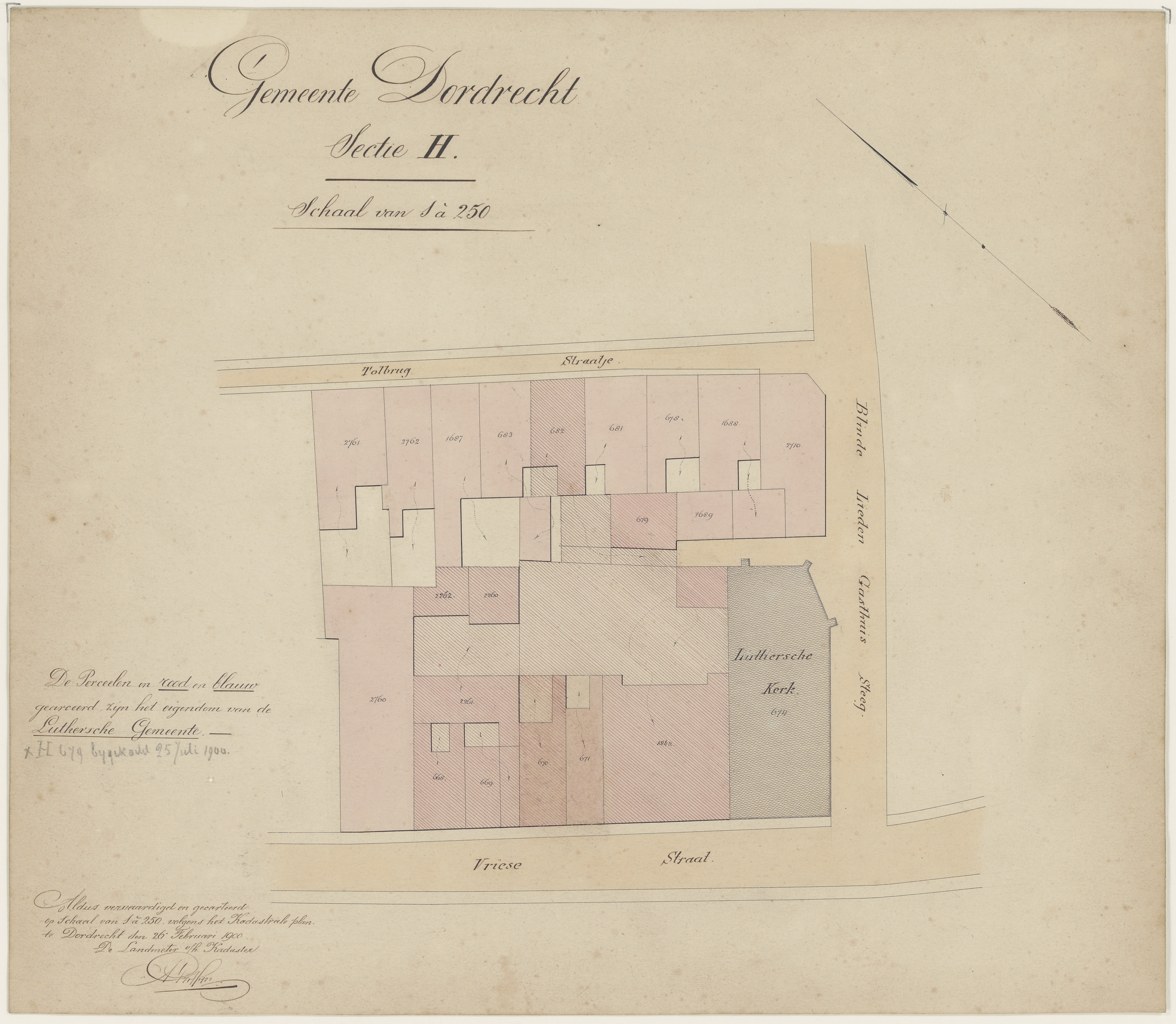 - Uittreksel van de kadastrale kaart van Dordrecht sectie H: Tolbrugstraat Landzijde, Blindeliedengasthuissteeg en Vriesestraat. Met het accent op perceel 674: de Lutherse Kerk.