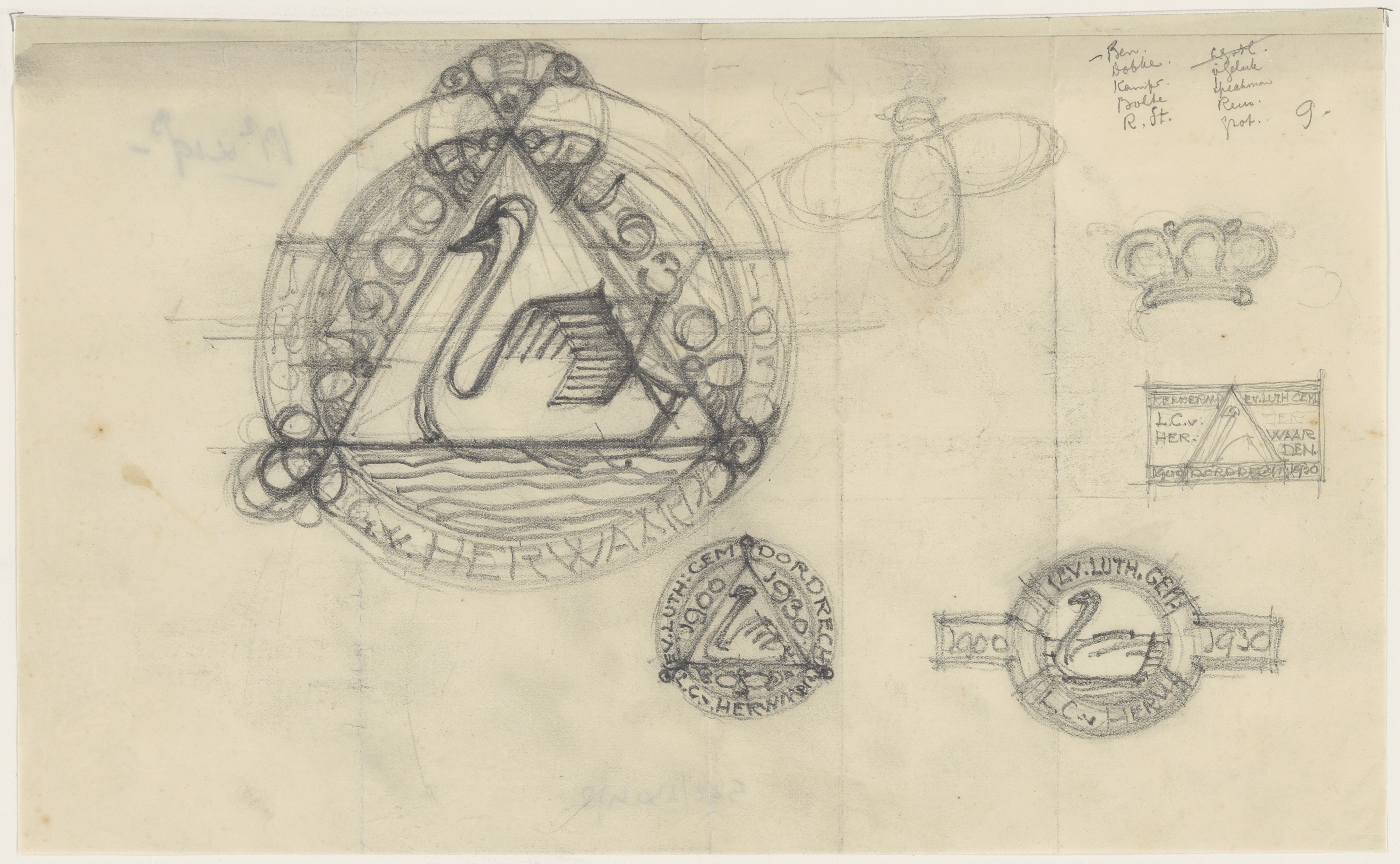 - Schetsen voor het ontwerp van een zilveren sigarendoosje voor L.G. van Herwaarden, kerkeraadslid van de Evangelisch-Lutherse gemeente te Dordrecht, als dank voor zijn verdiensten voor de verstandhoudingsverbeteringsvereniging Het Zwaantje.