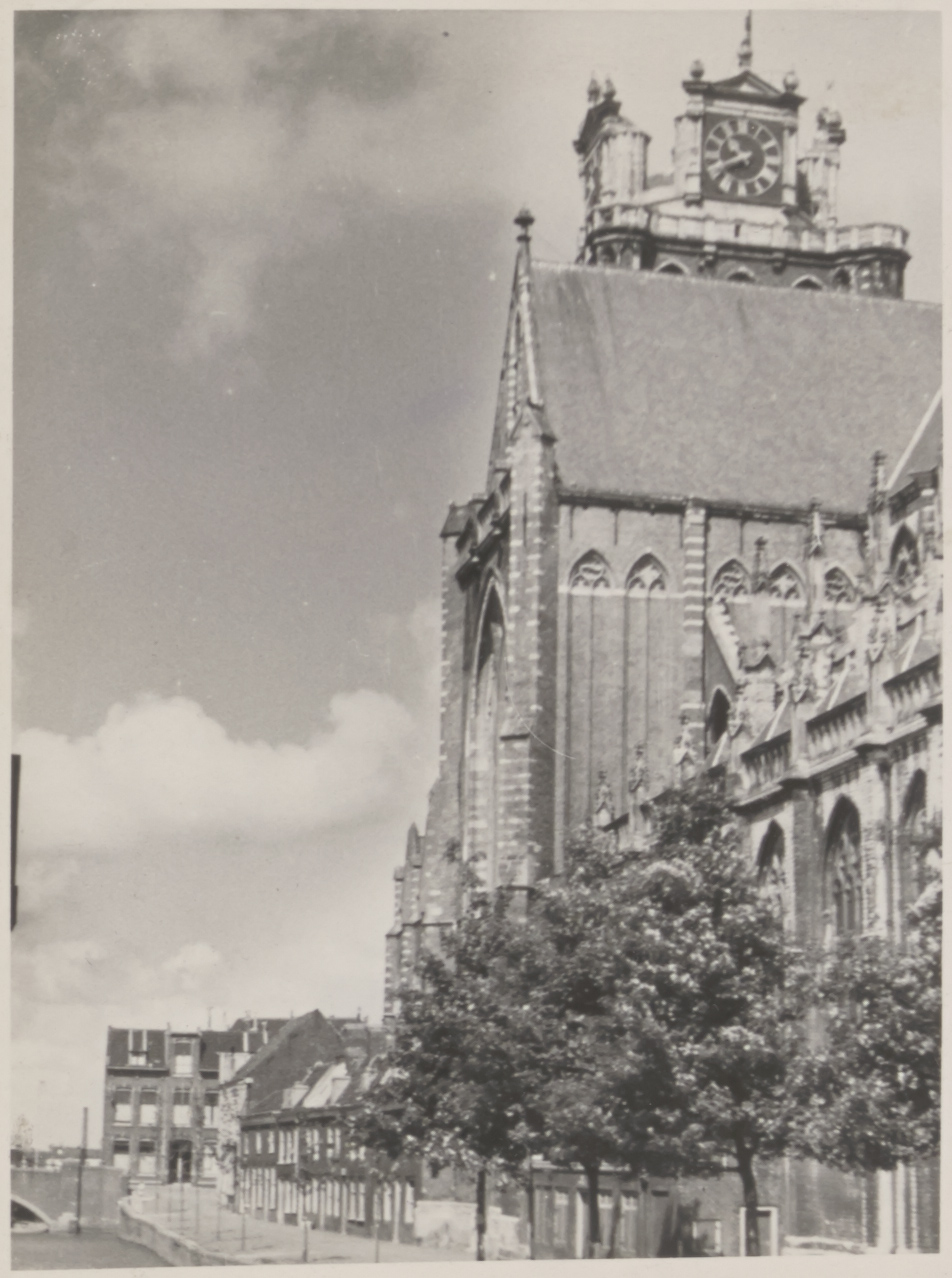 - Gezicht op de Grote Kerk uit het zuidoosten. Links de Leuvebrug, de Voorstraatshaven en de Pottenkade.