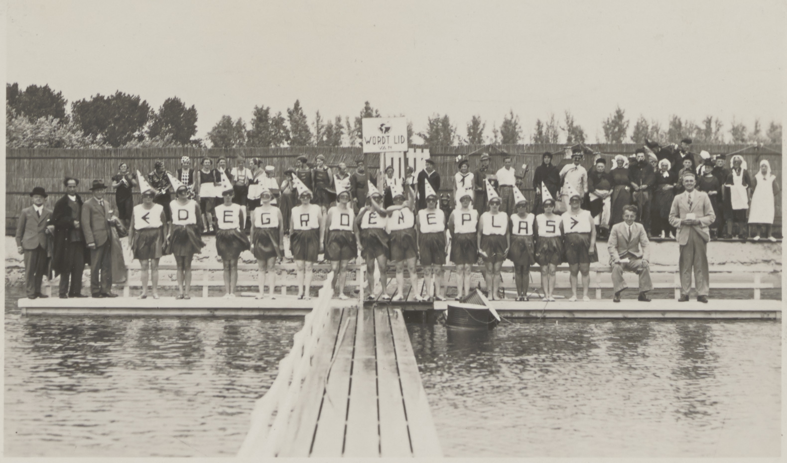 Mensen die reclame maken voor zwembad De Groene Plas aan de noordkant van de …