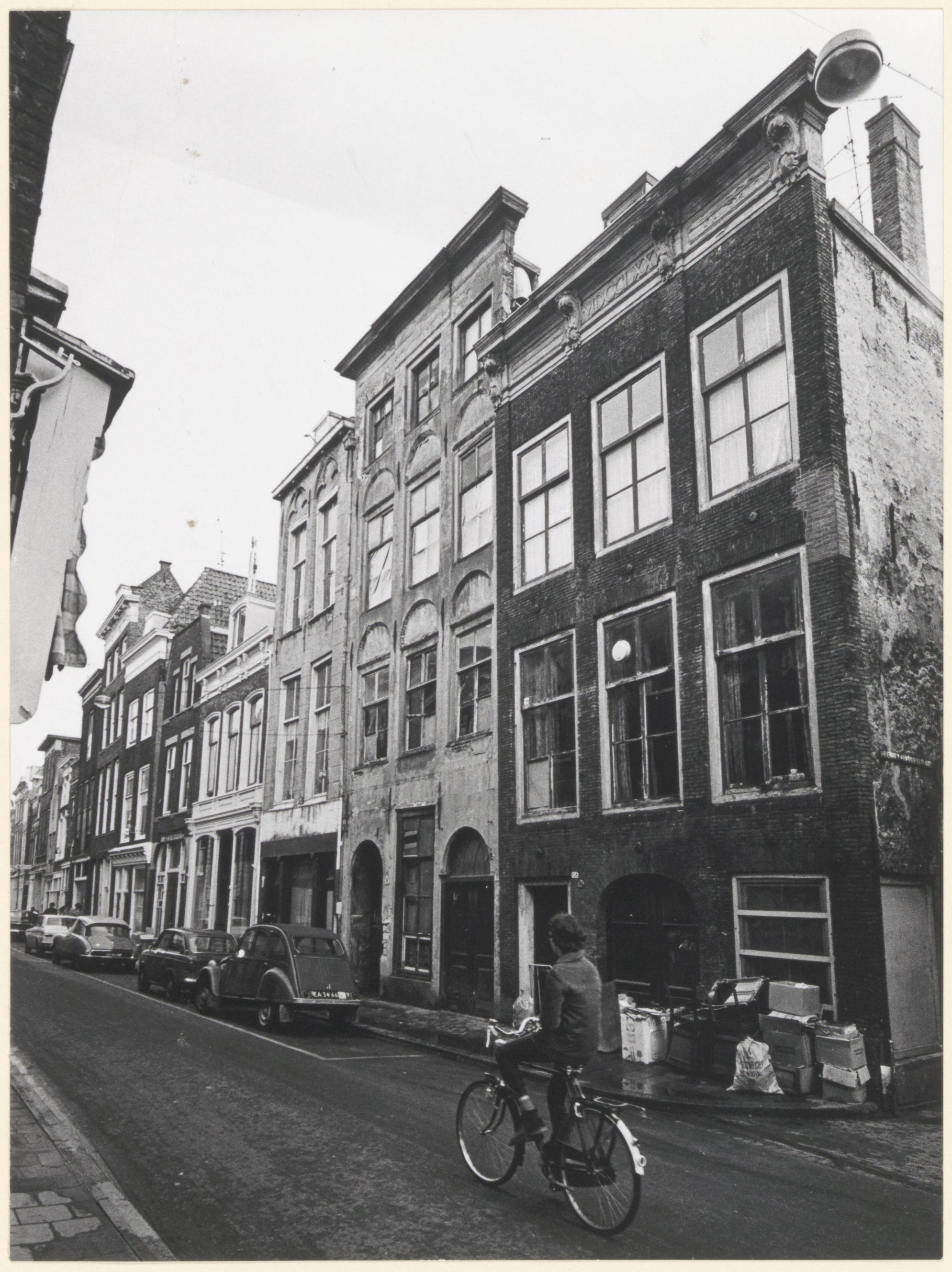 Nog niet gerestaureerde monumentenpanden aan de oostzijde van de Voorstraat tussen de Heer Heymansuysstraat (rechts) en de Nieuwkerkstraat, gezien vanaf de hoek van de Turfsteiger.