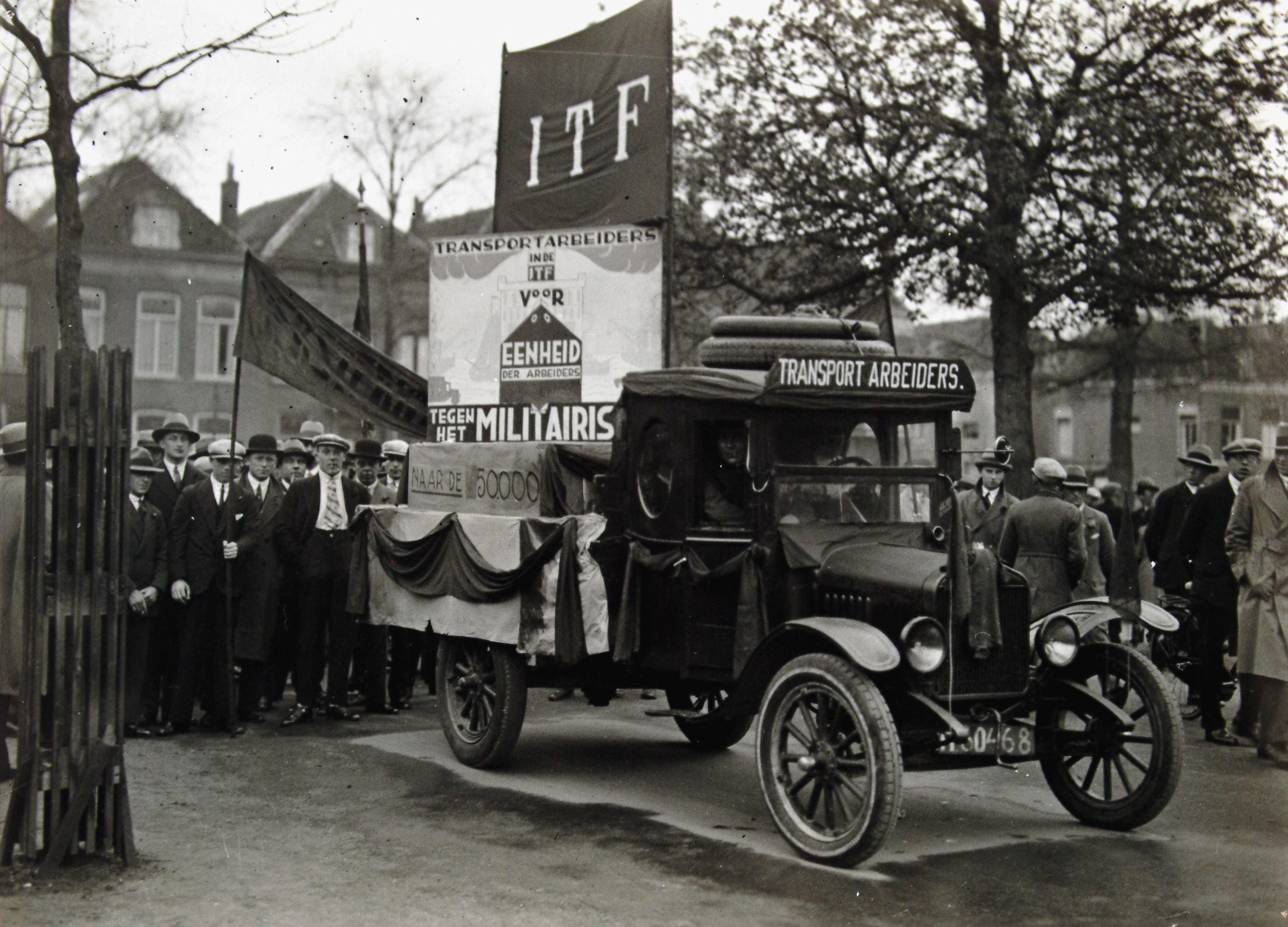 - Beverwijcksplein met op achtergrond de Matthijs Balenstraat. 1 Mei optocht. Auto beschikbaar gesteld door Boonstra-expediteur aan de Dubbeldamseweg. Leden van de Centrale Bond Transportarbeiders, onder wie veel schippers en sleepbootkapiteins. I.T.F. International Transport Federation.
