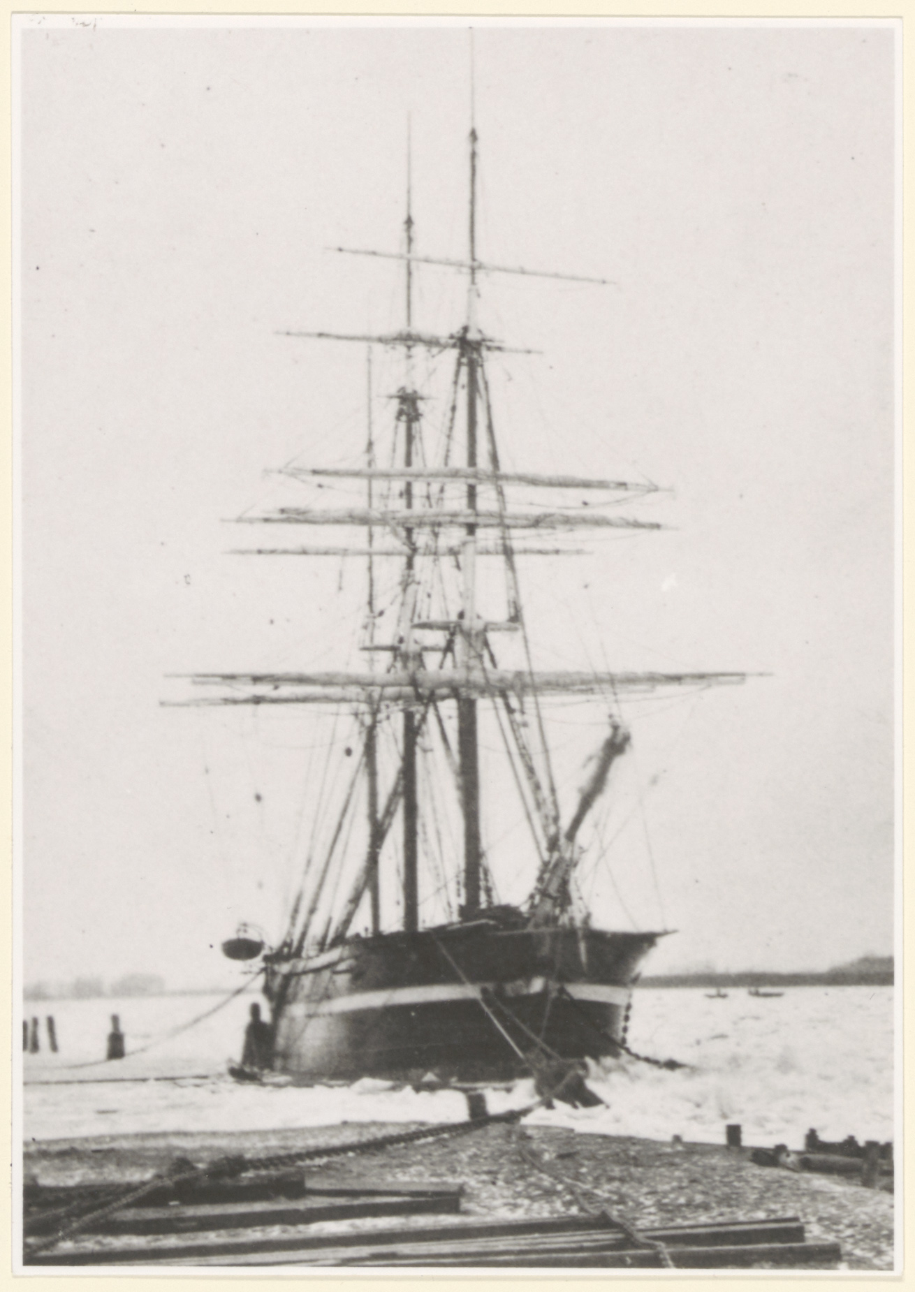 De zeilschip/driemaster J.C.Schotel, liggende voor de Buiten Kalkhaven in de Oude Maas met ijsgang. Gebouwd in 1848 op werf van Gips, in 1869 verkocht naar Batavia.