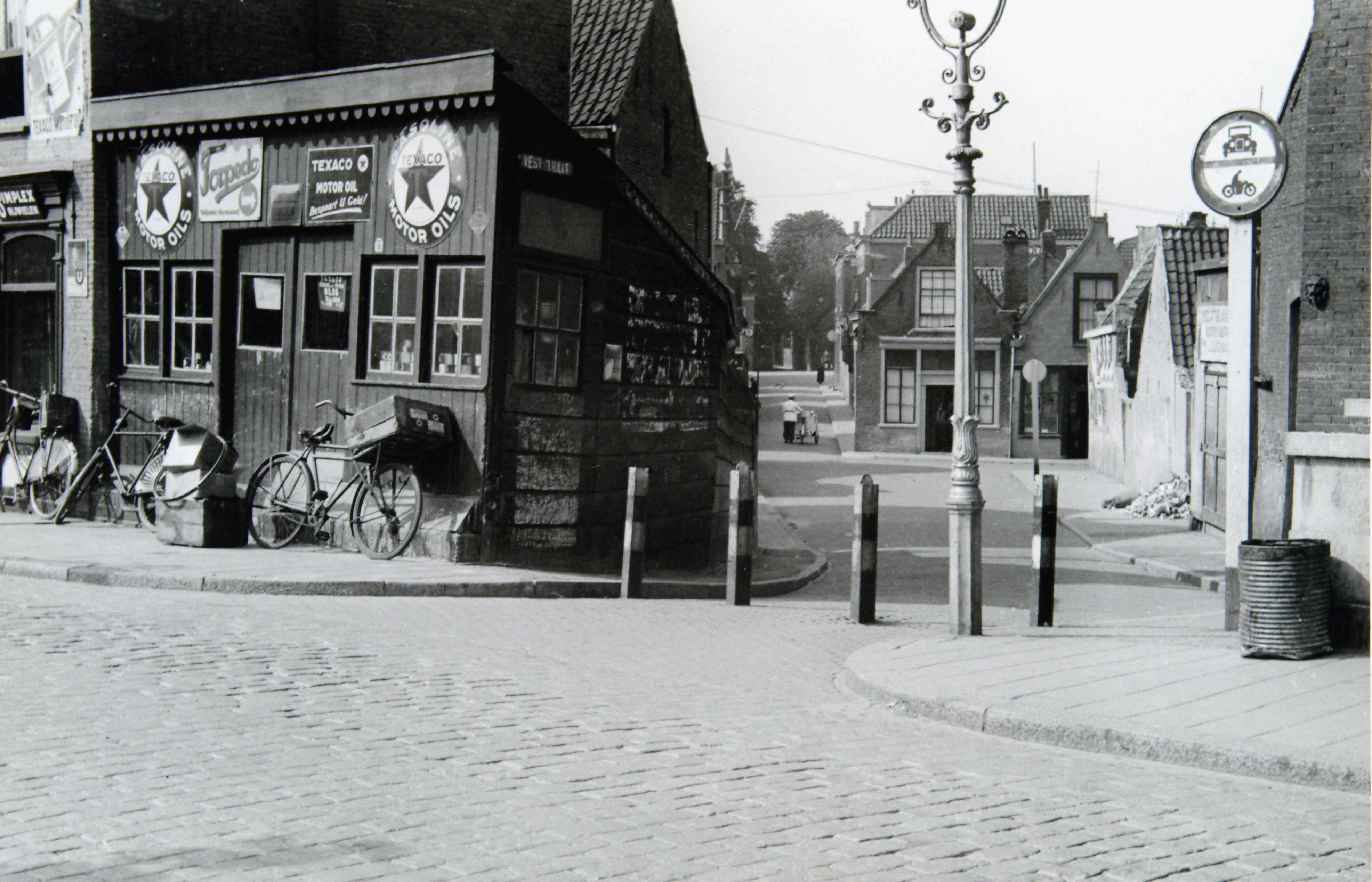 - Veststraat vanaf de Vest in zuidelijke richting gezien. Links een gedeelte van de rijwielzaak en bezinepomphouder van J. de Roo.