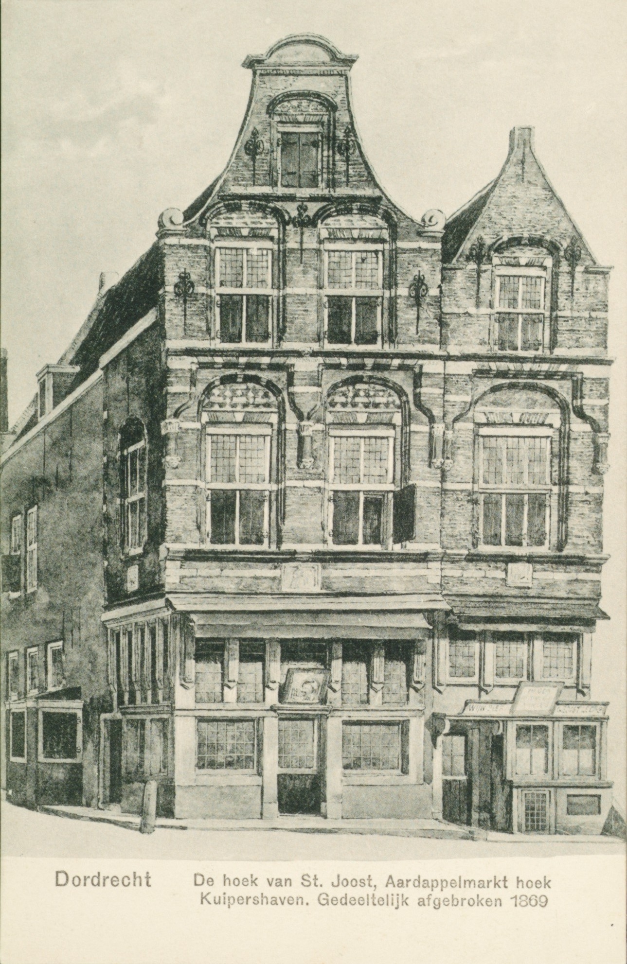 De hoek Aardappelmarkt - Kuipershaven (links) met het huis Sint Joost.