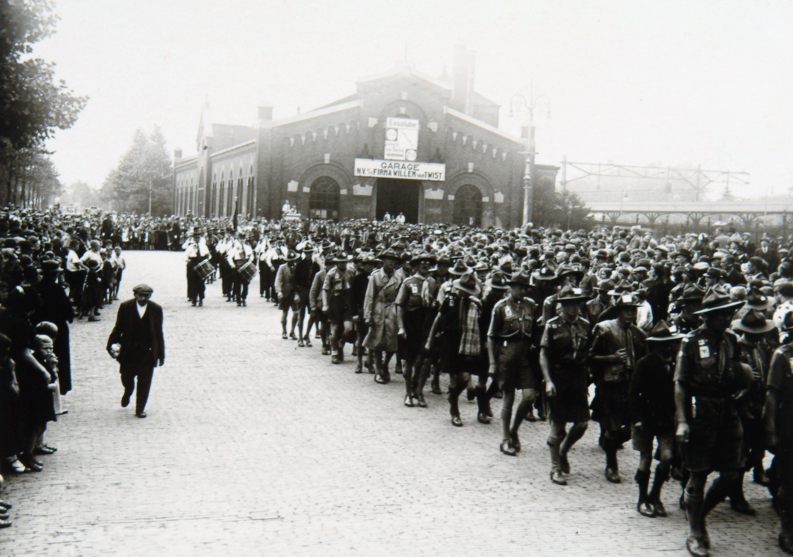 - Engelse padvinders brengen na de Jamboree een bezoek aan Dordrecht. Zij lopen op de Burgemeester de Raadtsingel bij het station. Het gebouw is de locomotievenloods.