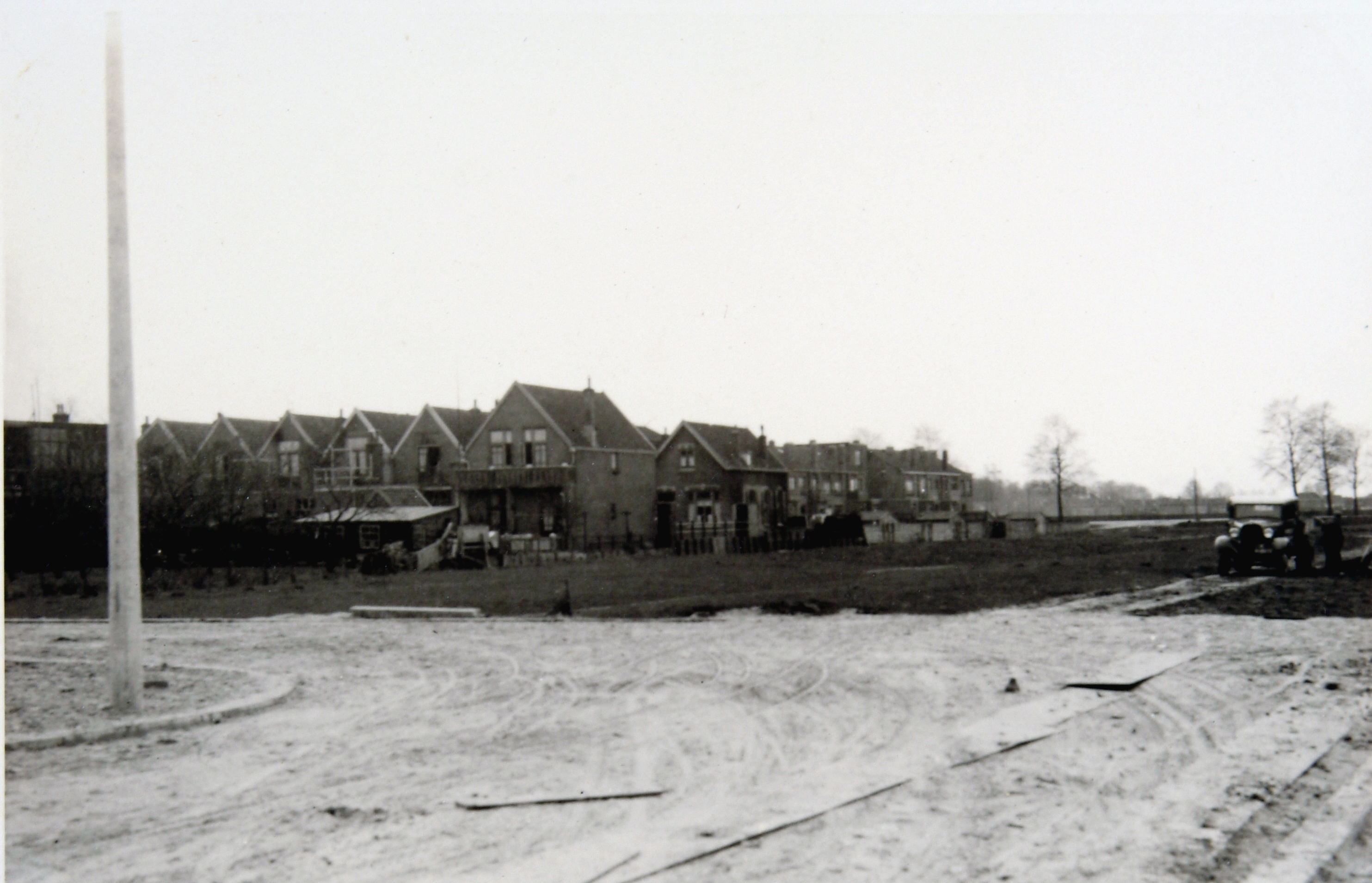Gezicht vanaf de hoek van de Van Baerlestraat en de Brederodestraat langs de achterzijde van de bebouwing van de Hooftstraat naar de Brouwersdijk. De Van Baerlestraat wordt doorgetrokken in de richting van de Brouwersdijk.