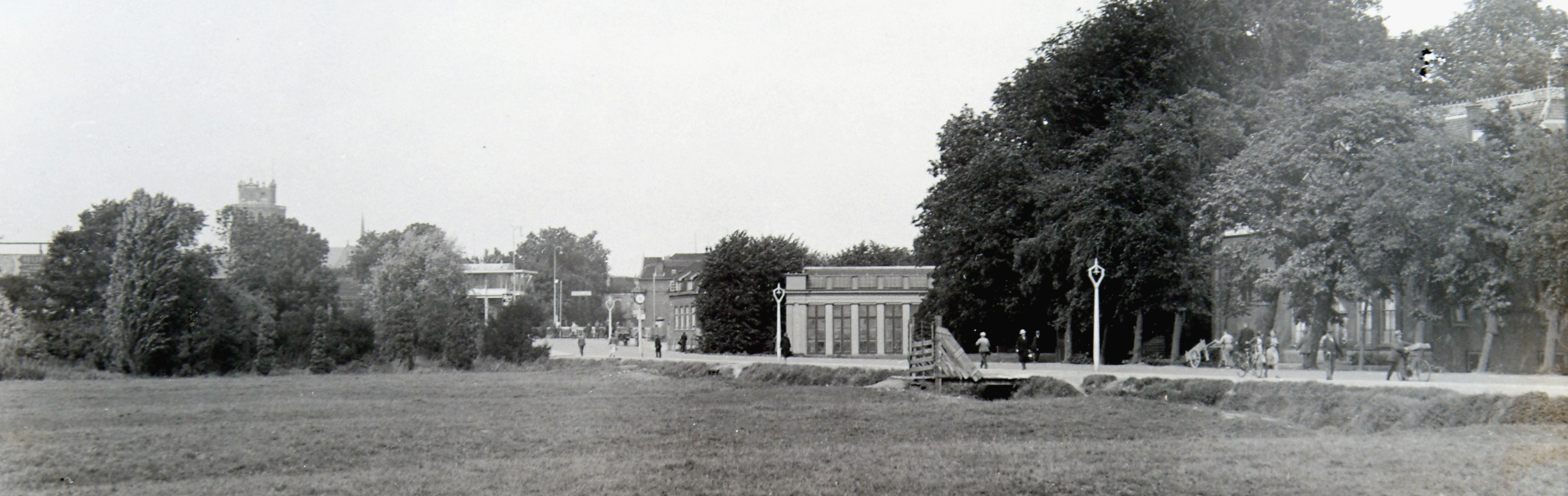 Overweg aan de Krispijnseweg, rechts Weizigt met het plantenhuis. Vanuit de Hooftstraat over de wei van De Roo naar het noorden gezien.