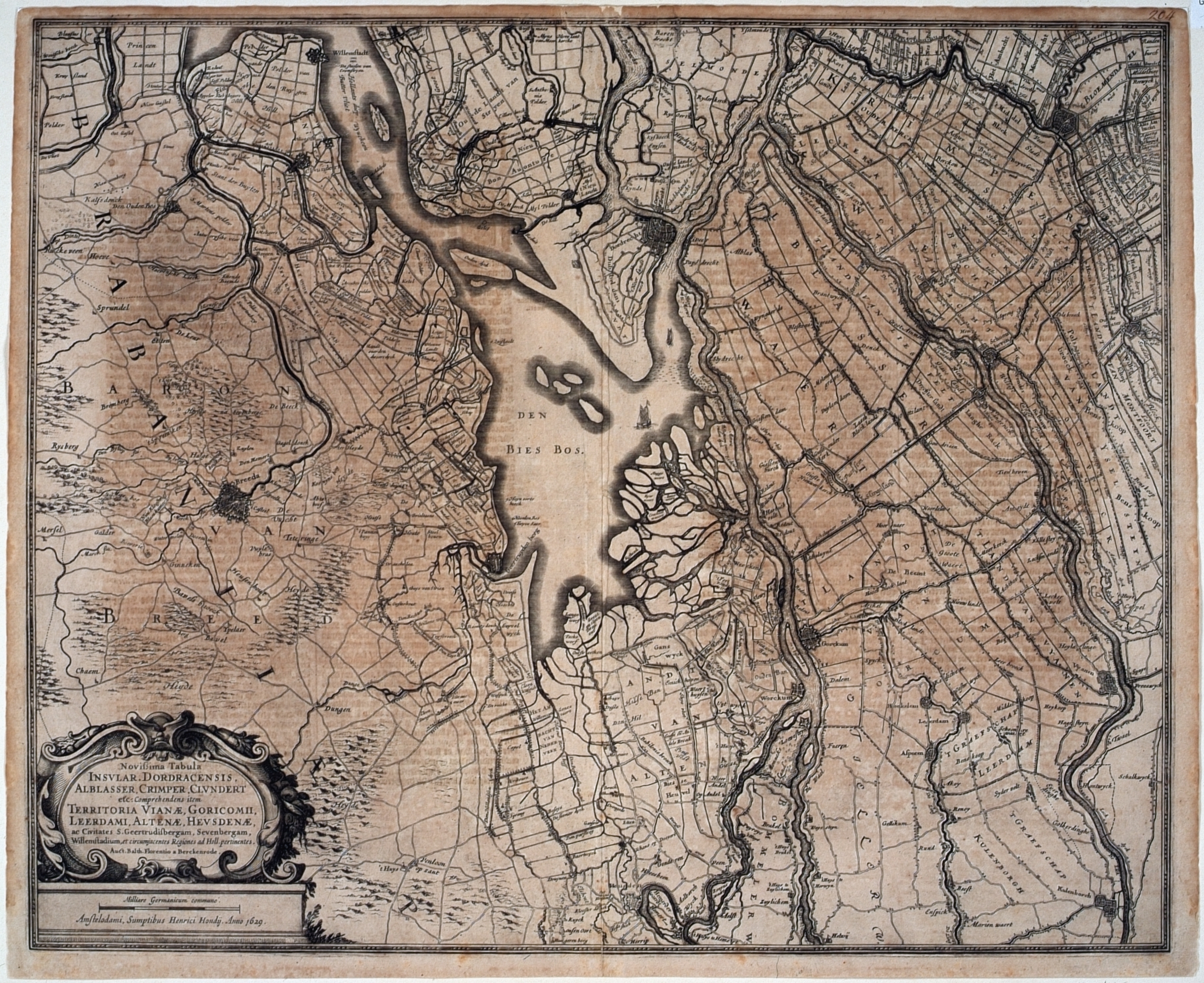 Kaart van een gedeelte van het voormalige Zuid-Holland, na 1629. Titel: Novissima Tabula Insular, Dordracensis, Alblasser, Crimper, Clundert etc. Comprehens item Territoria Vianae, Goricomii, Leerdami, Altenae, Heusdenae, ac. civitates S. Geertrudisbergam, Sevenbergam, Willem-stadium, ac. circumjacentes Regiones ad HoIl. pertinentes.