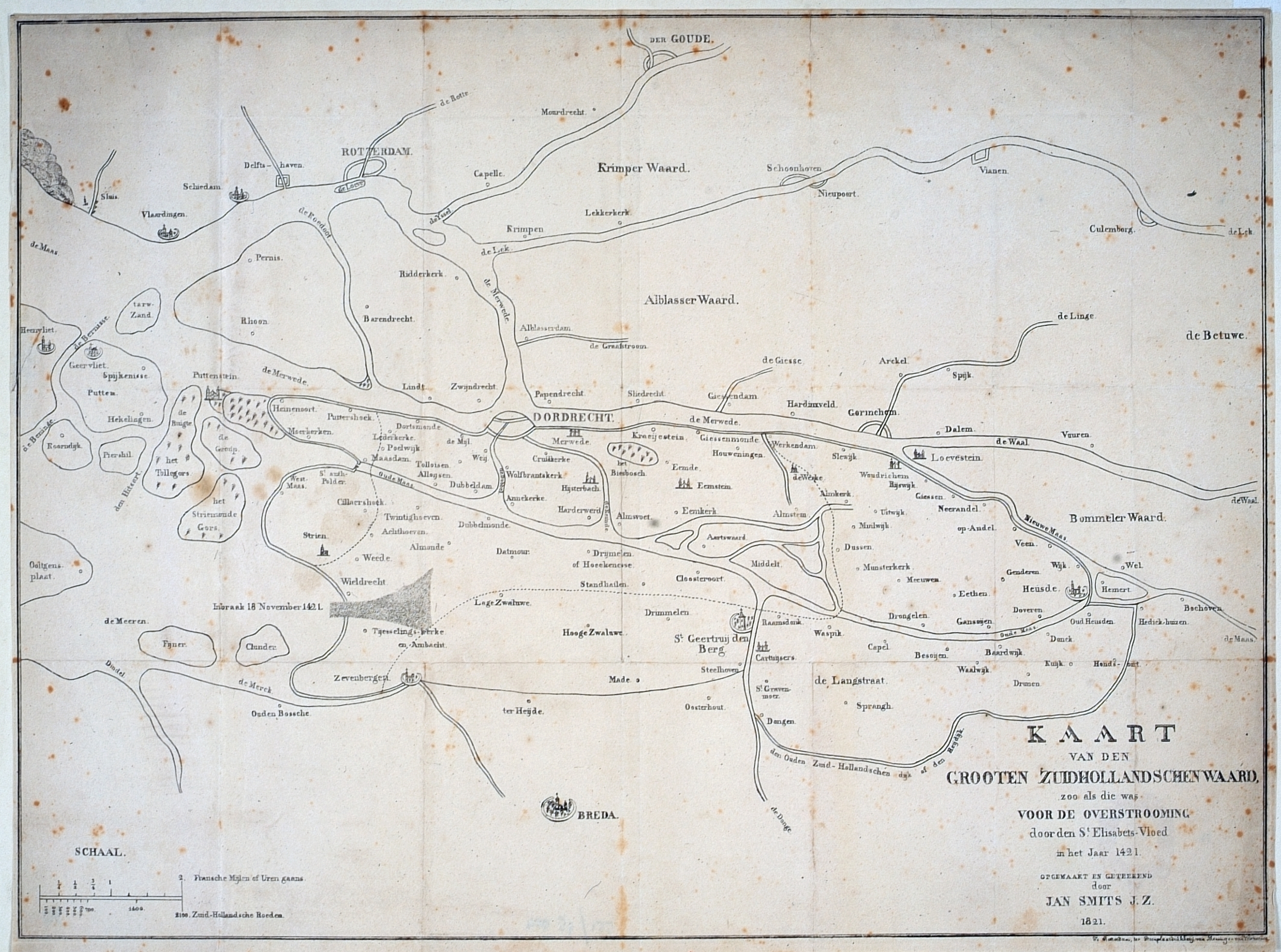 - hxb: 44,3 x 60 cm. Getekend door Jan Smits Jz. Uit: Verhandeling over de inbraak en overstrooming van de Groote Zuidhollandsche Waard, 18 nov. 1421; het twee eeuwen ondergelopen gebleven gebied is op deze kaart met een stippellijn aangegeven.