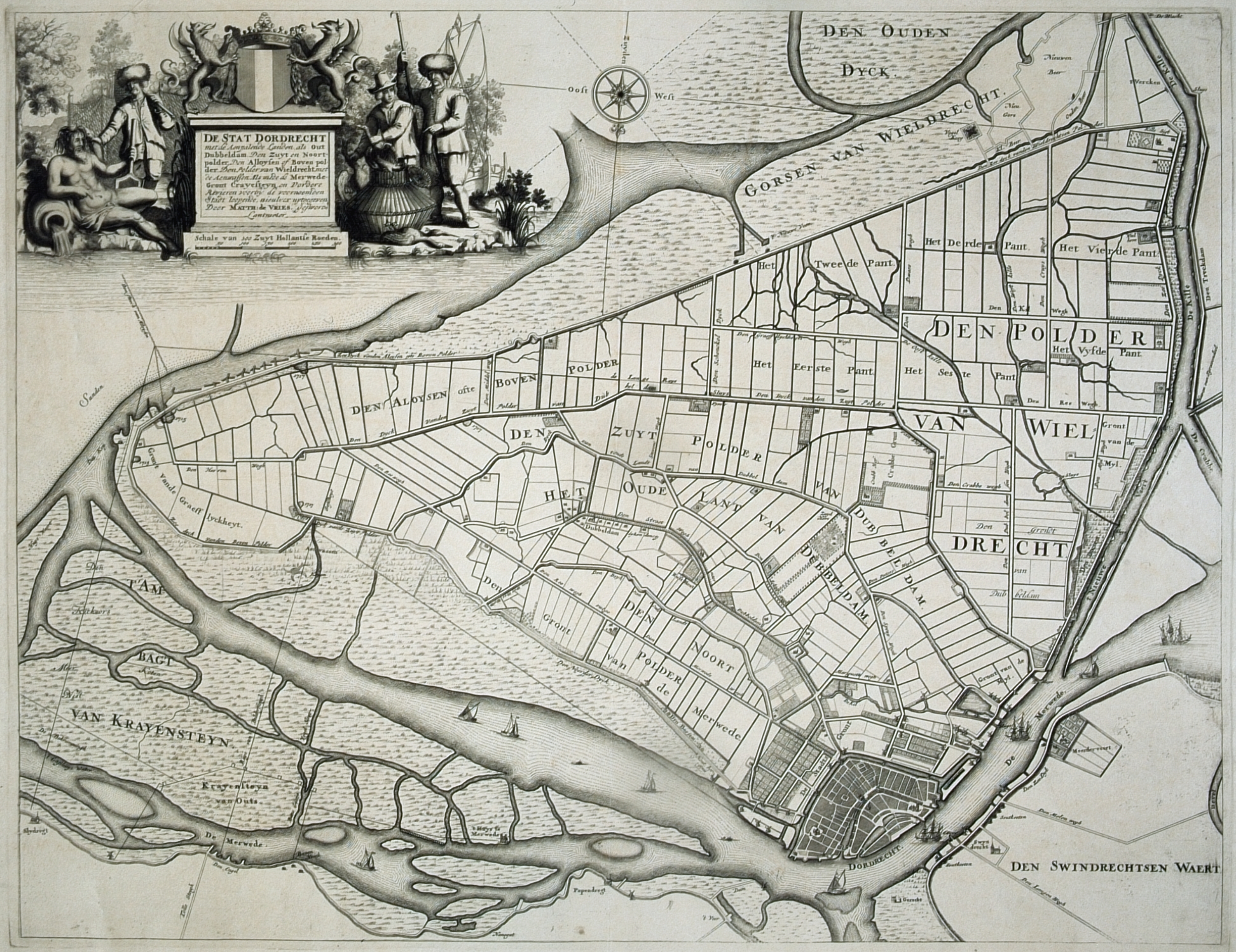 - Kaart van het Eiland van Dordrecht na 1717, vervaardigd door Mattheus de Vries, met het Oudeland van Dubbeldam, de Noordpolder, de Zuidpolder, de Alloyzen- of Bovenpolder en de polder Wieldrecht, de stad Dordrecht en de ambachten Dubbeldam, Wieldrecht en de Mijl; met linksboven een titelzuil met wapen van Dordrecht en figuren die de jacht en visserij symboliseren.