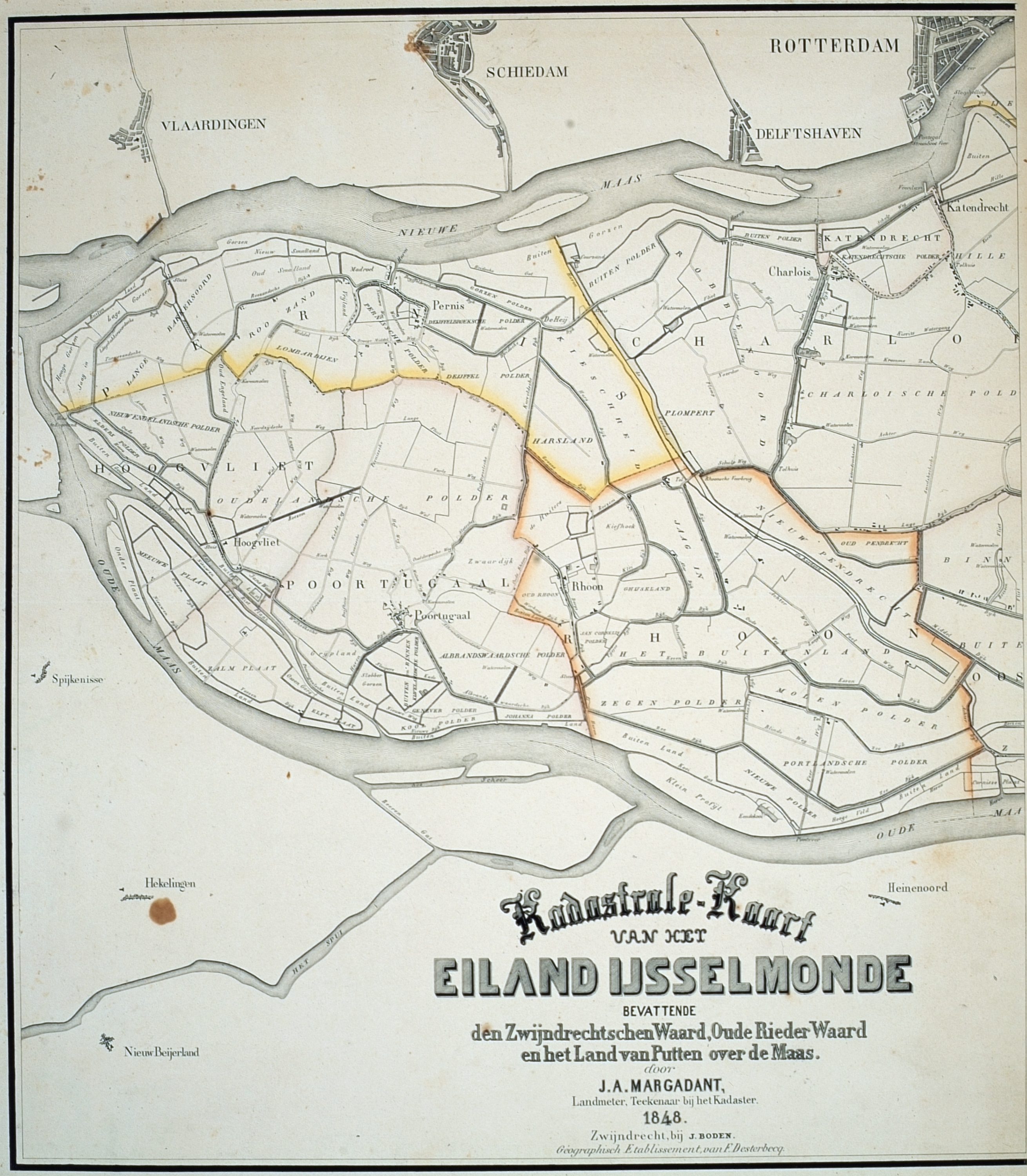 Eerste blad van de kadastrale kaart van het eiland IJsselmonde, bevattende de Zwijndrechtse Waard, de Riederwaard en het land van Putten over de Maas, door J. A. Margadant, schaal 1 à 25.000.