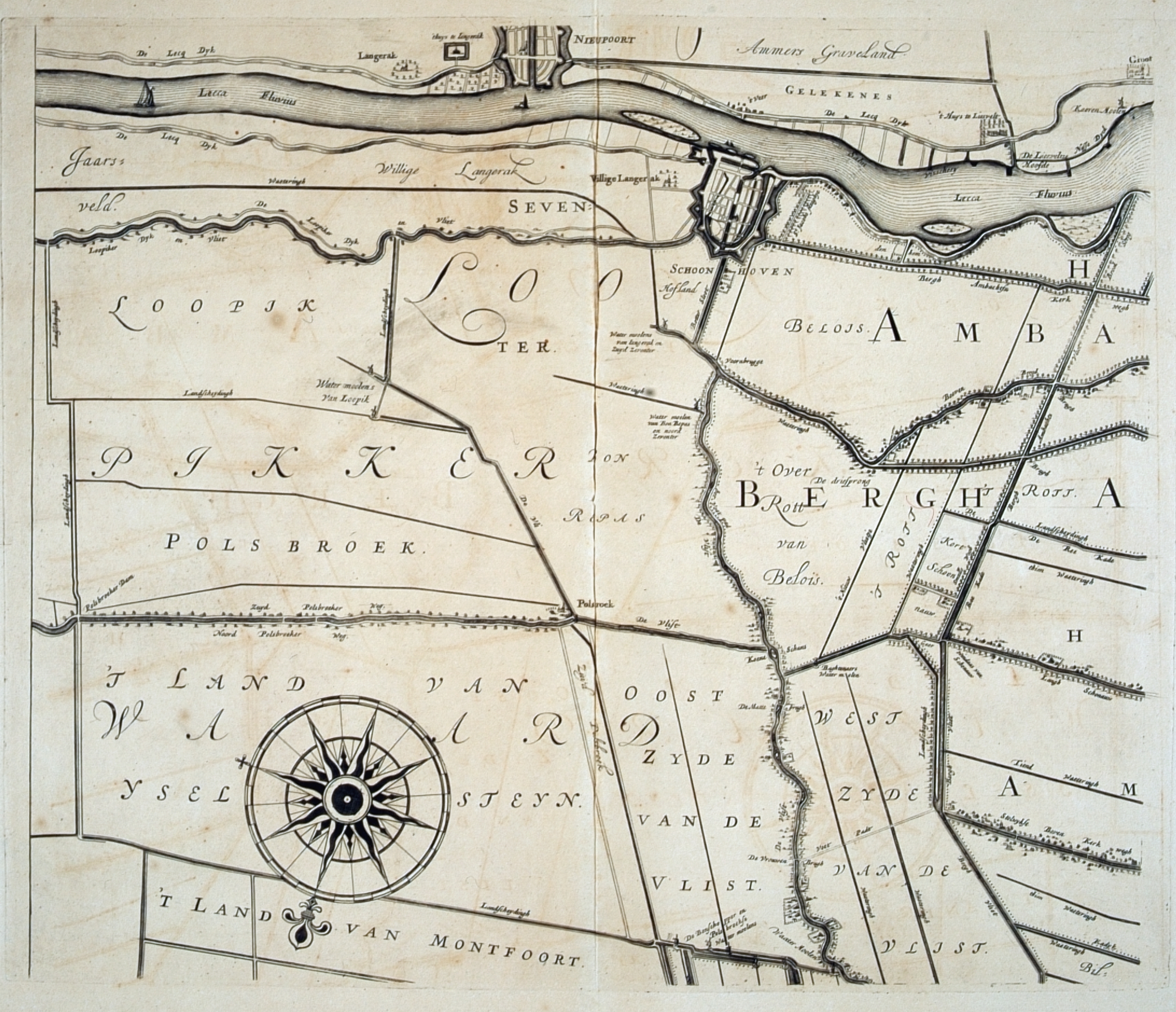 - Blad 1 van de kaart in zes bladen van het hoogheemraadschap van de Krimpenerwaard met de daarin gelegen polders, ambachten en hoge heerlijkheden, vervaardigd in opdracht van de dijkgraaf en hoogheemraden in 1681 en 1682.