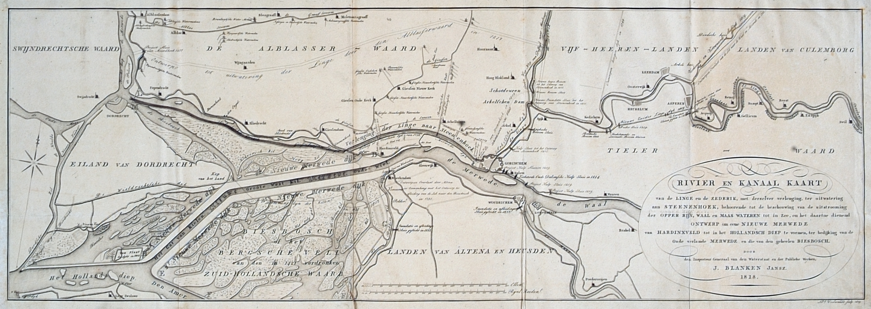 Ontwerp tot aanleg van een Nieuwe Merwede van Hardinxveld tot in het Hollandsch Diep en de bedijking van de oude Merwede langs Dordrecht en de gehele Biesbosch alsmede rivierwerkzaamheden aan de Linge en de Zederik, door de Inspecteur-Generaal van de Waterstaat J. Blanken Jansz, 1818.